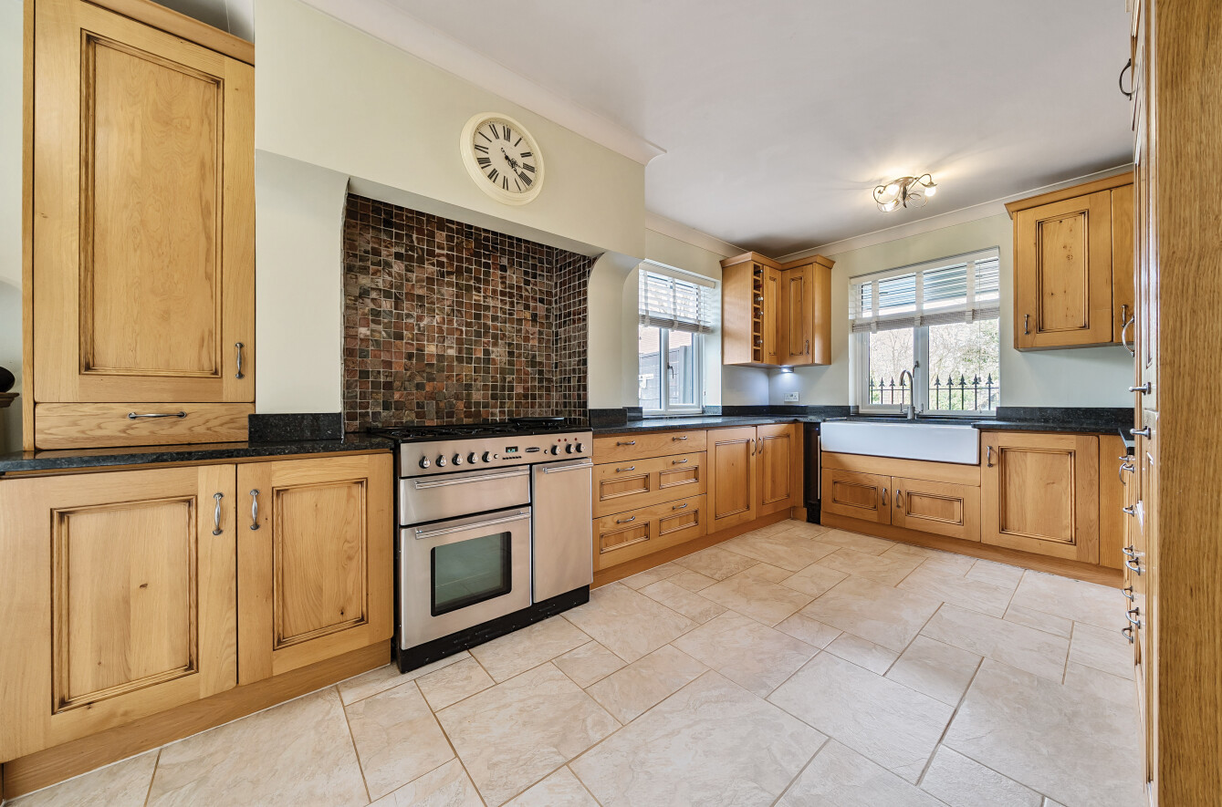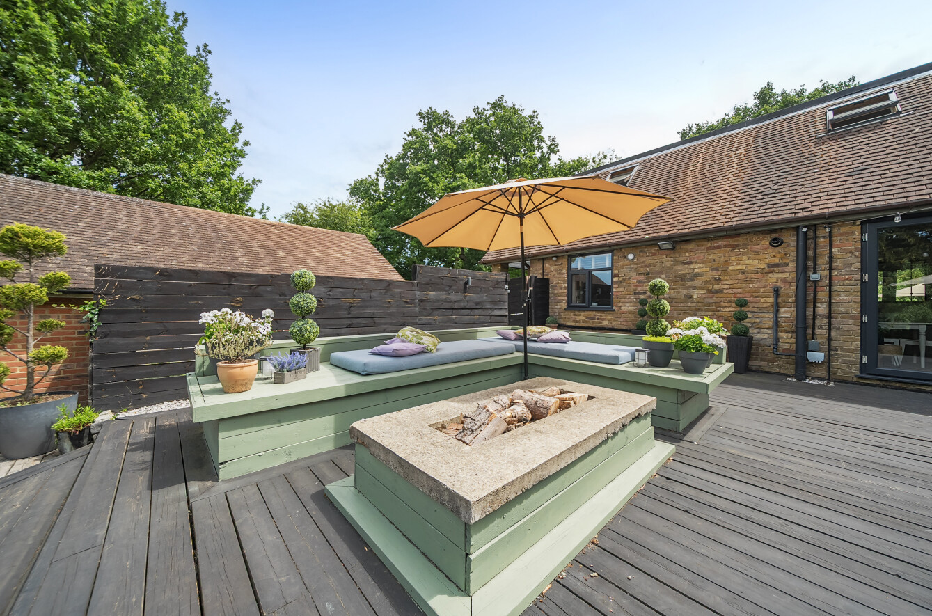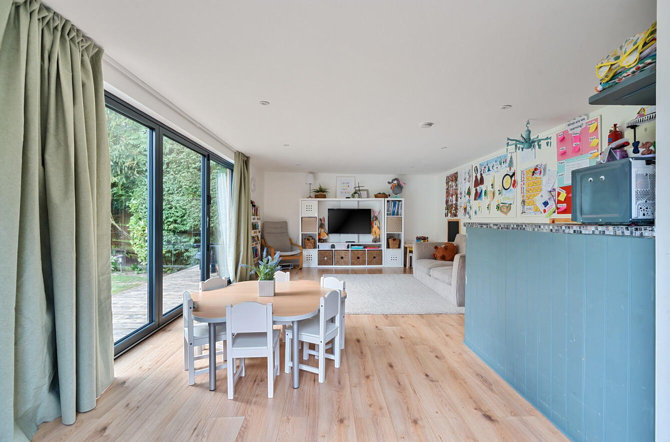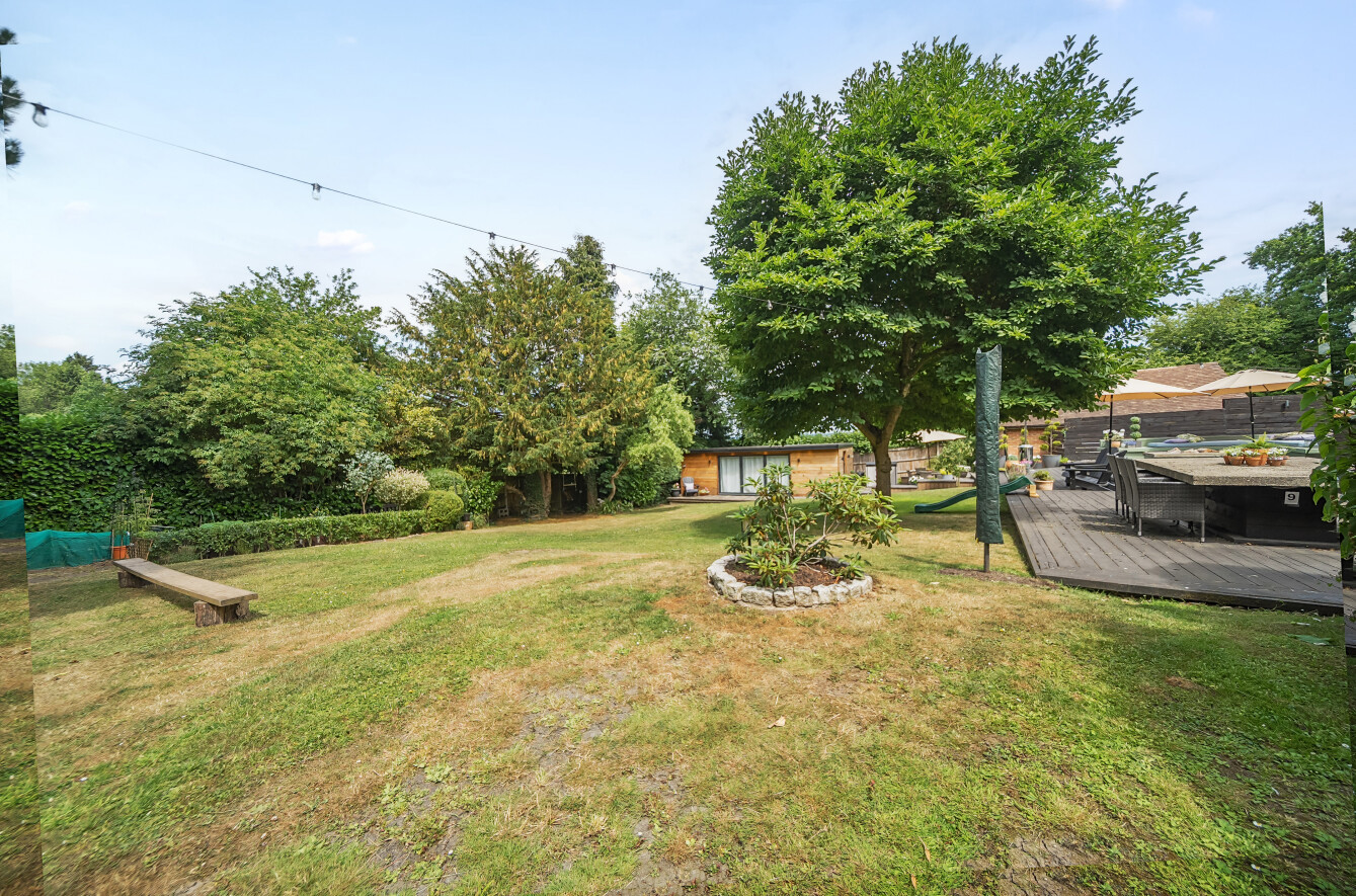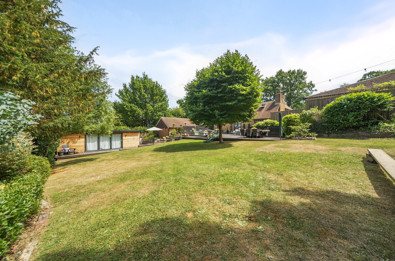 The stunning garden measures approximately 105' x 89'. It has a large decked seating area accessible from the kitchen making it ideal for al-fresco dining. The remainder is laid to lawn with a backdrop of mature trees and shrubs. Also in the garden is a timber summerhouse which is ideal for use as a home office, gym or teenagers den.
