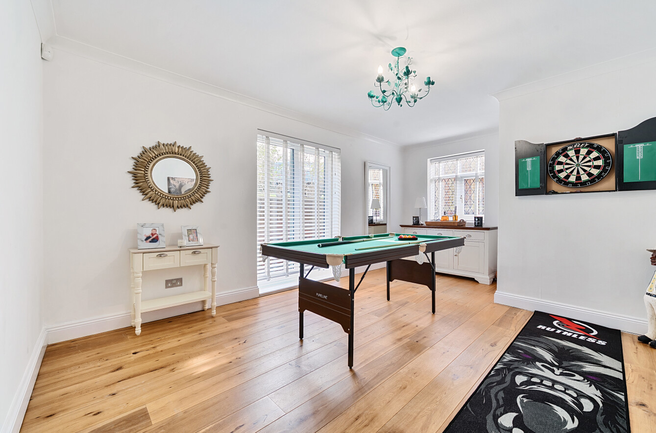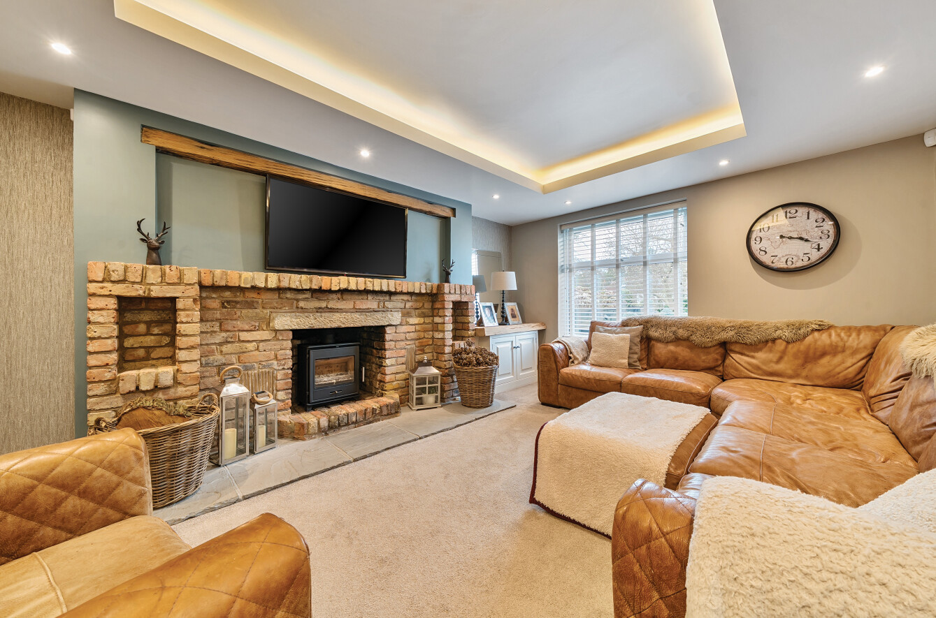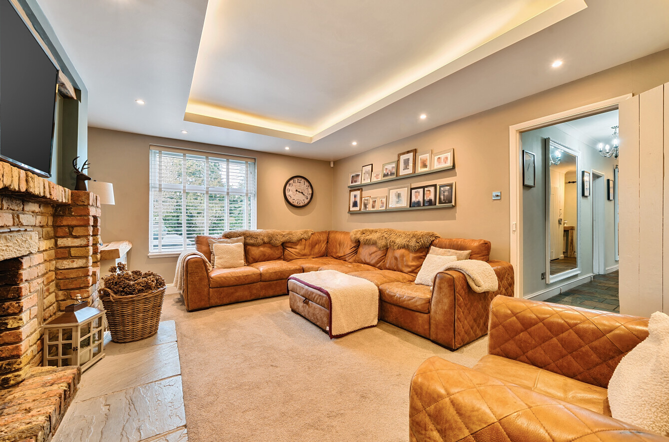 Also on the ground floor is an elegant sitting room with recessed lighting and a feature exposed brick fireplace, a double aspect family room with double doors into the garden and a further room which is currently used as a fifth bedroom but could also be a playroom or study.