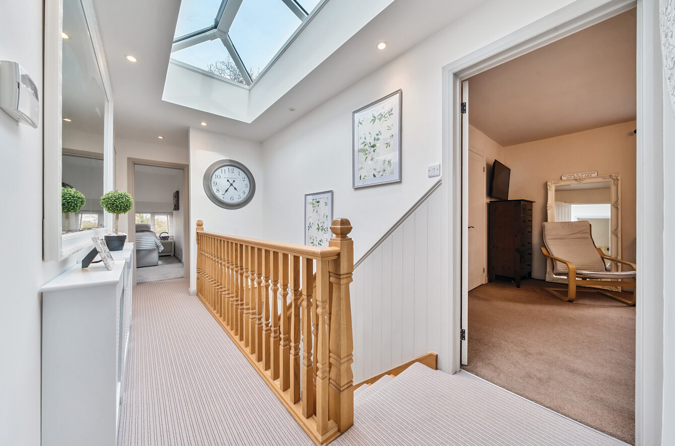 Stairs lead up to the first floor landing where there is a large roof lantern creating a real sense of light and space.