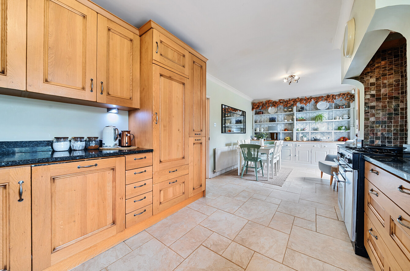 With views of the garden is the country style kitchen/dining room. Fitted with a comprehensive range of wall and units with contrasting worktops, space for a range style cooker, a fitted double dresser and space for a dining table and chairs. The windows and patio doors allow for plenty of natural light and access out into the garden making it an ideal place to spend time with the family or entertain during the summer months.