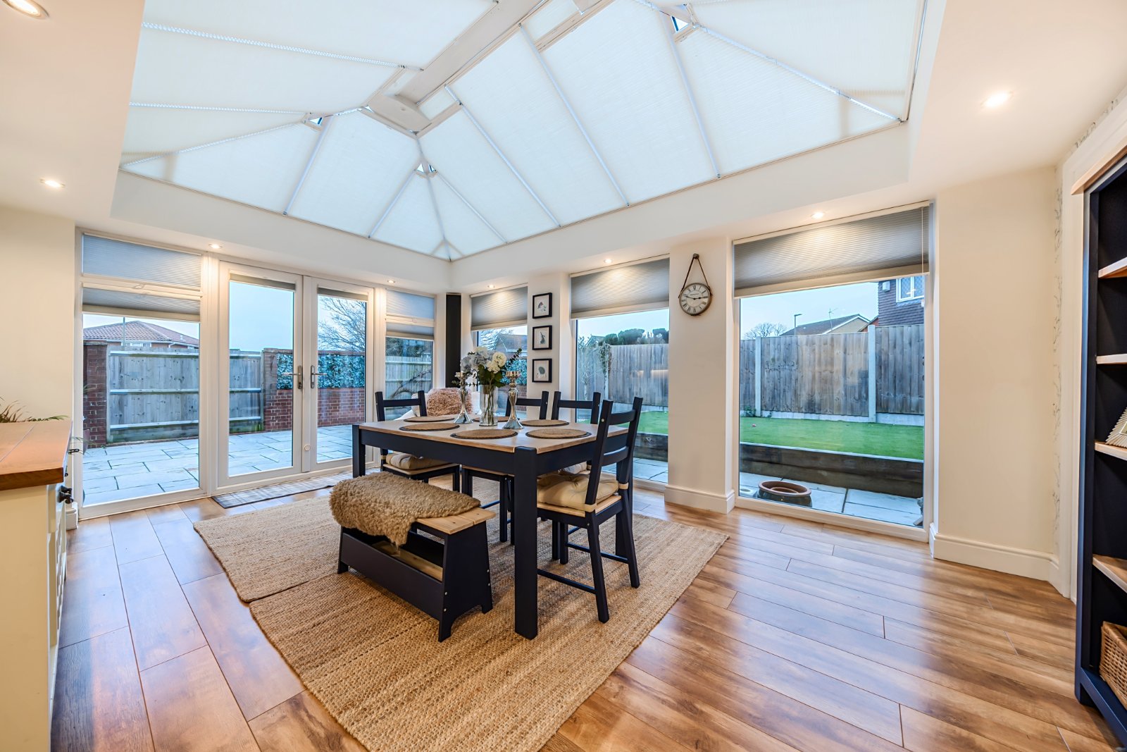 To the first floor is a large master bedroom with fitted wardrobes and the benefit of a modern three piece en-suite bathroom. In addition, there are three further bedrooms, all with fitted wardrobes, plus a modern three piece family bathroom.