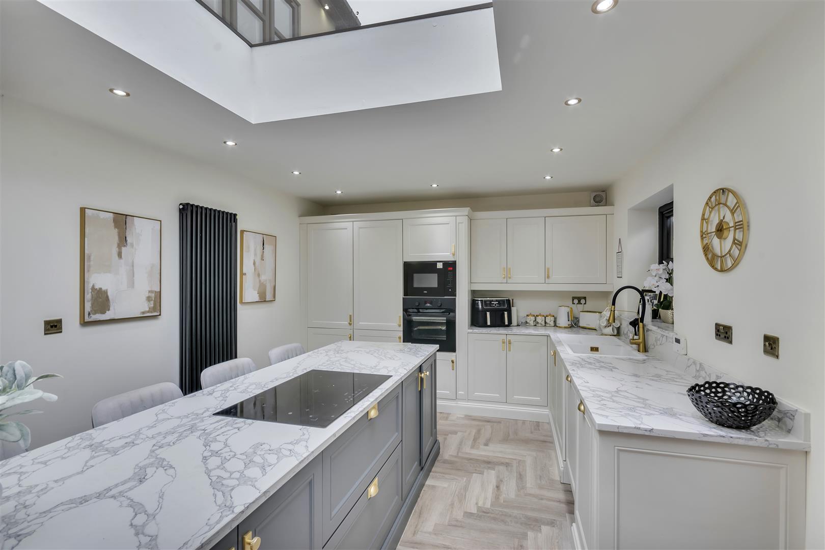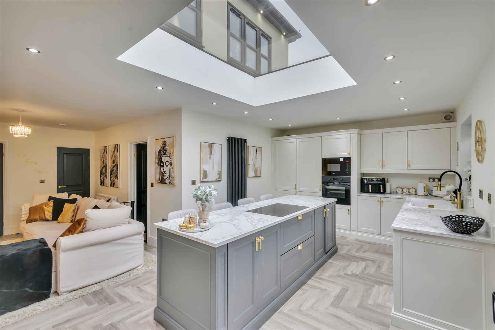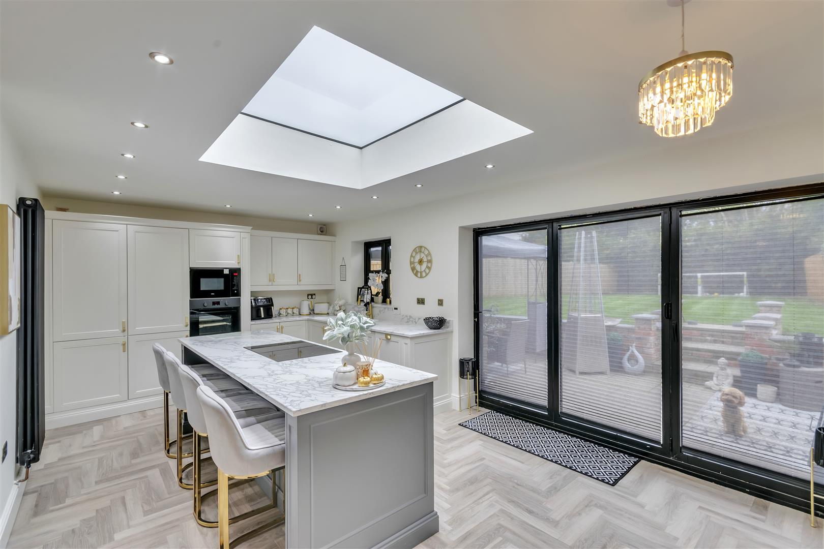 Kitchen/Breakfast Room - 3.760 x 6.709 (12'4" x 22'0") - Rear aspect patio doors and windows, large open plan room, range of eye and base units, large central island hob and four seat breakfast bar with glass window above, heated towel rail, sink and mixer tap, wood effect flooring, integral fridge/freezer, micro wave, oven dishwasher and waste bin