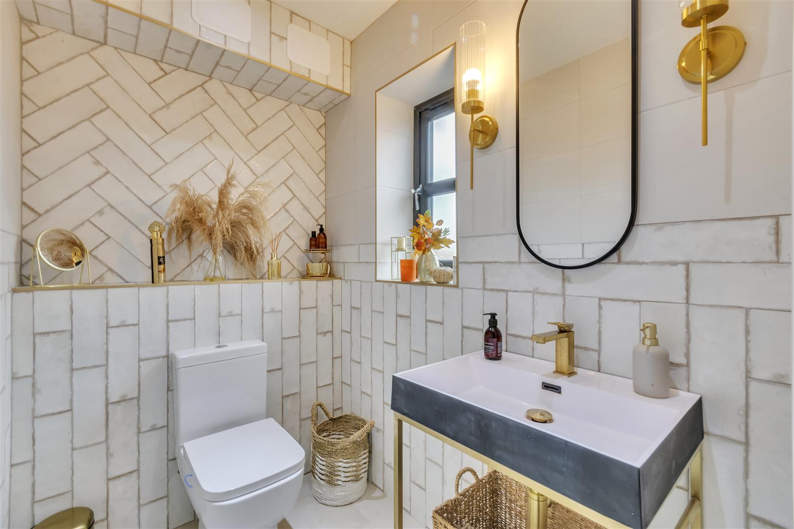 Guest Cloakroom - Side aspect windows, hand basin, low level WC, tiled walls and floor and heated towel rail