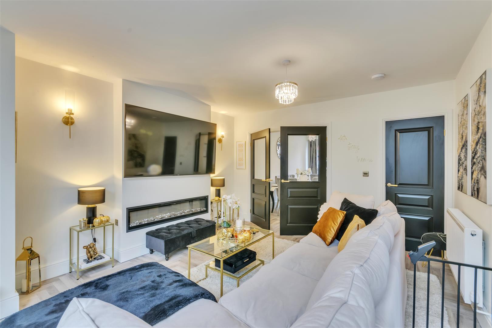 Lounge - 3.825 x 5.745 (12'6" x 18'10") - Open planned layout with kitchen, side aspect window, radiator with thermostatic valve, wood effect flooring, under stairs storage cupboard