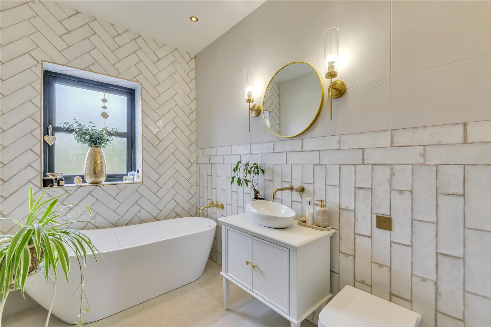 Family Bathroom - 1.801 x 3.086 (5'10" x 10'1") - Rear aspect obscured glass windows, bath, heated towel rail, tiled floor and walls, hand basin and low level WC