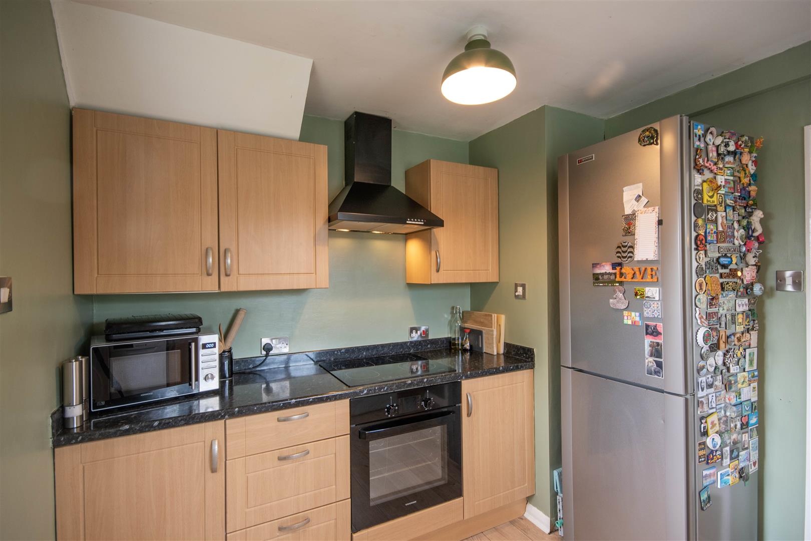 Kitchen - 2.872 x 3.504 (9'5" x 11'5") - Range of eye and base units, wood flooring, oven and hob, extractor hood, stainless steel sink unit and mixer, side aspect 1/2 glazed door and rear aspect windows, space for fridge/freezer, dishwasher, washing machine and dryer