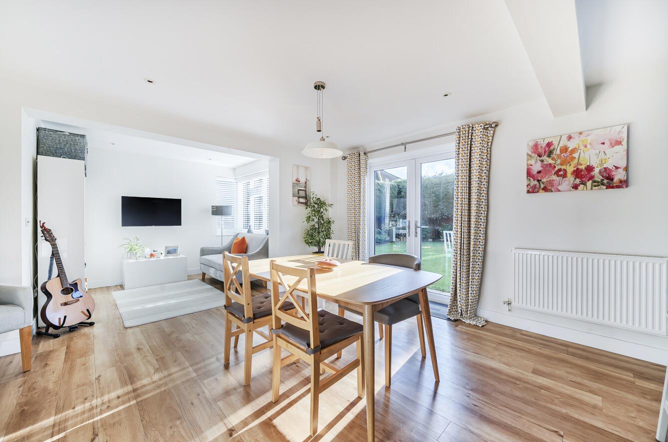 Dining Area: - Space for table and chairs and double doors to rear garden, Karndean flooring, open plan to snug area: