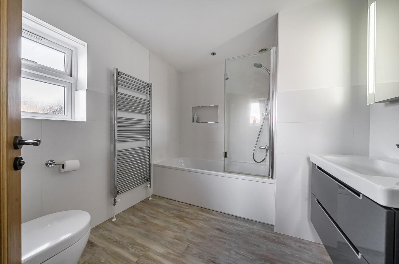 Bathroom: - Re-fitted modern suite by Villeroy and Boch comprising bath with mixer the tap and shower attachment, wash basin with cupboard under, WC, Amtico floor, wall mounted cabinet.