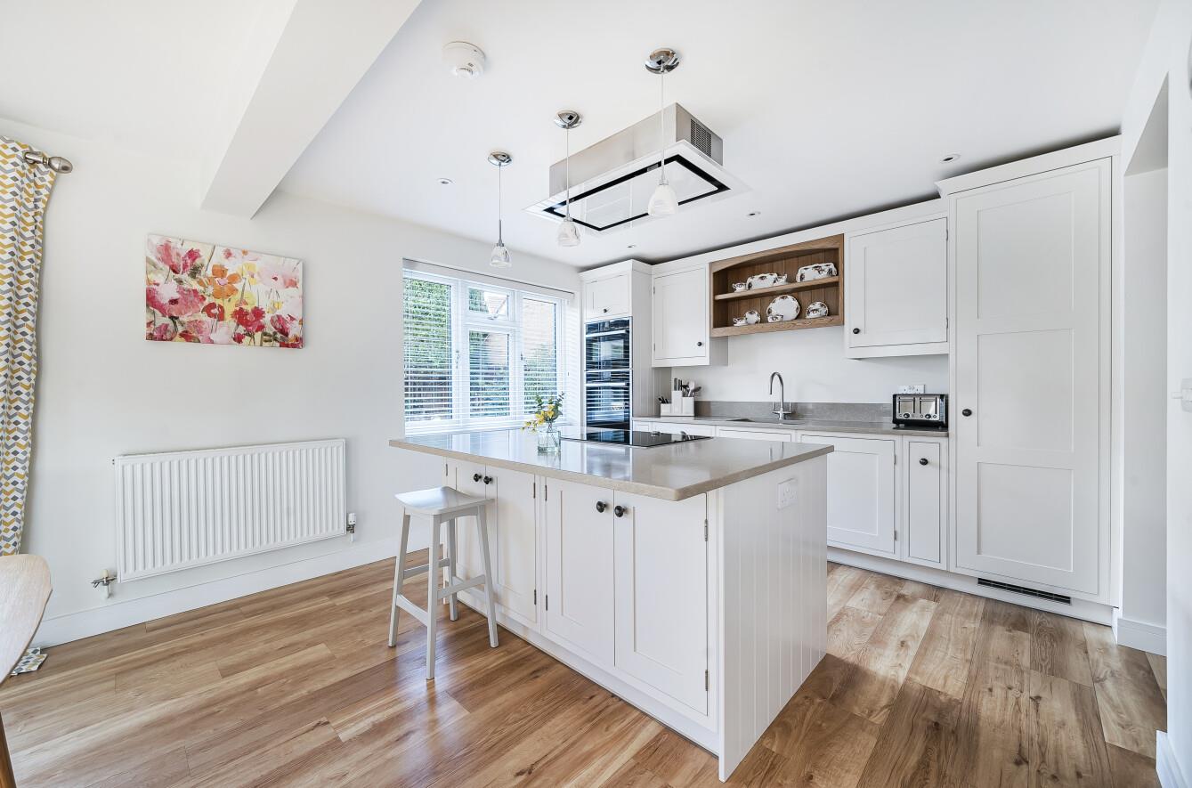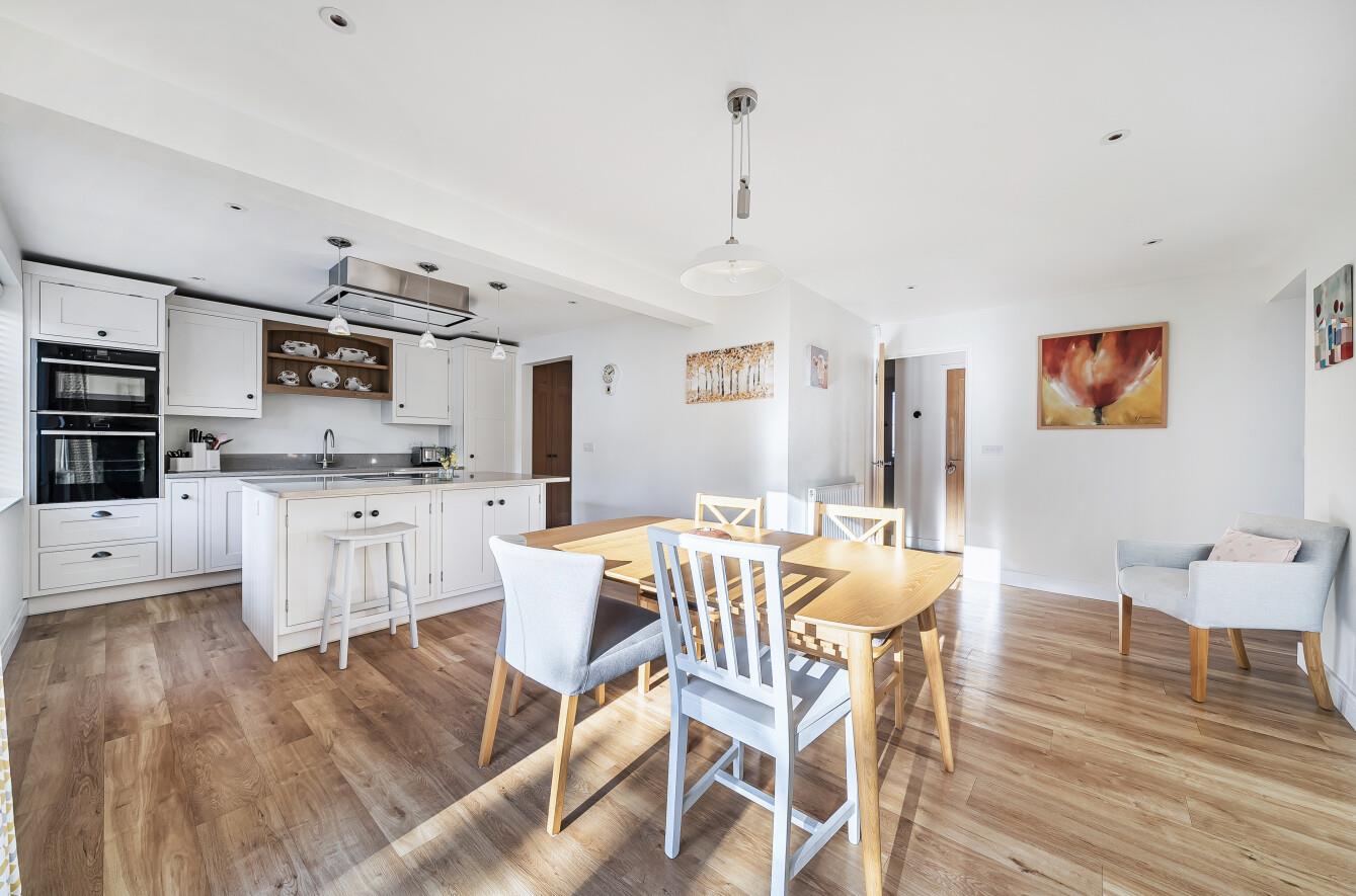Kitchen Area: - 21'9" x 17'3" (6.63m x 5.26m) The kitchen area has been re-fitted with an attractive range of bespoke units and quartz worktops, island units with inset induction hob and extractor hood over and breakfast bar to one side. Built in electric oven and combination oven/microwave, integrated dishwasher and full height fridge. All the appliances are Neff. Larder cupboard and further built in under stairs cupboard, Karndean flooring, open plan to dining area: