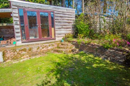 The property is approached via a gravel driveway offering parking for 3 vehicles. There is a gateway which leads to the front garden which is laid mainly to lawn with shrubs. To the rear is a walled courtyard, with steps to a lawned garden, raised flower bed and a timber outbuilding with patio doors which has the potential to be a home office/gym or summer room.