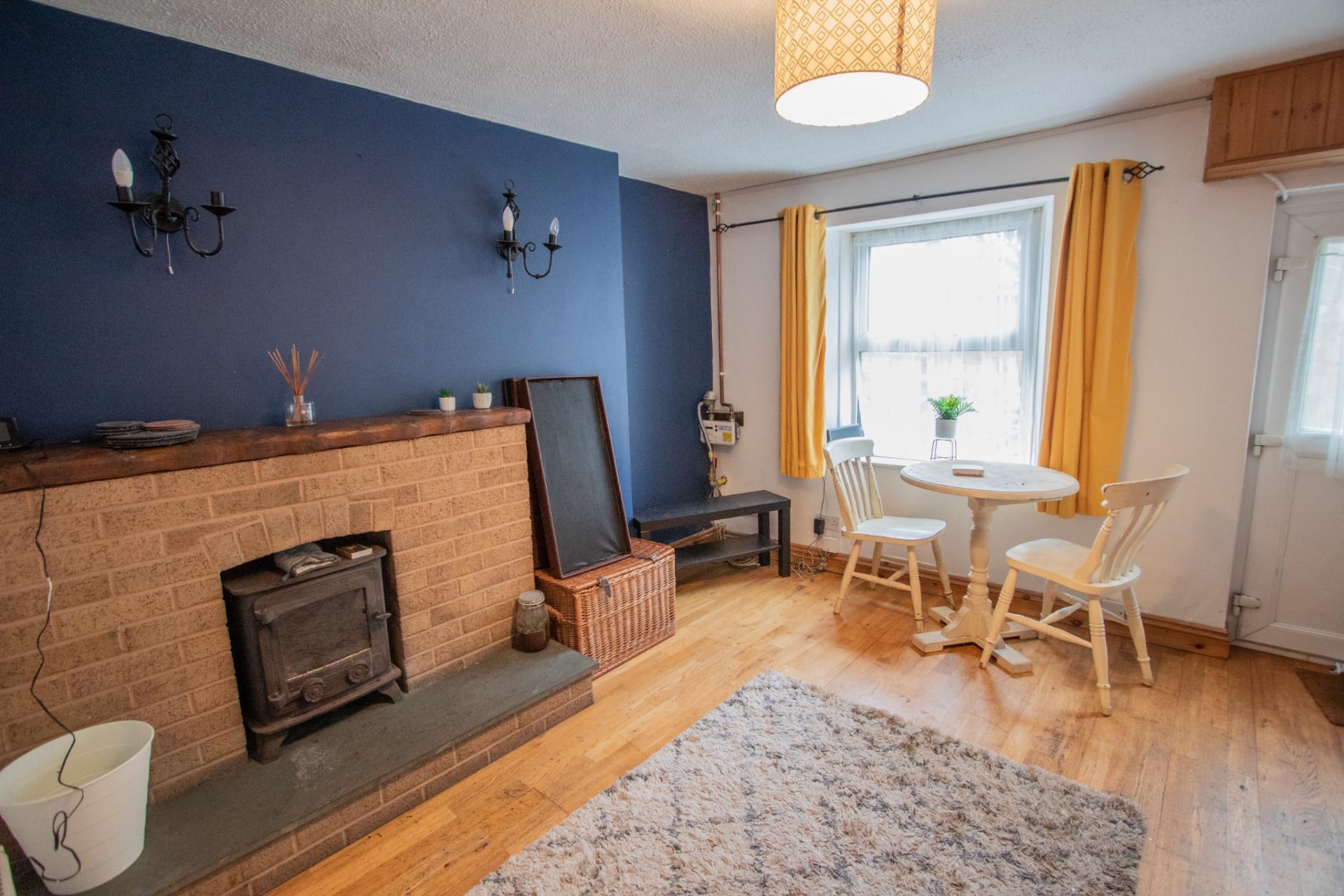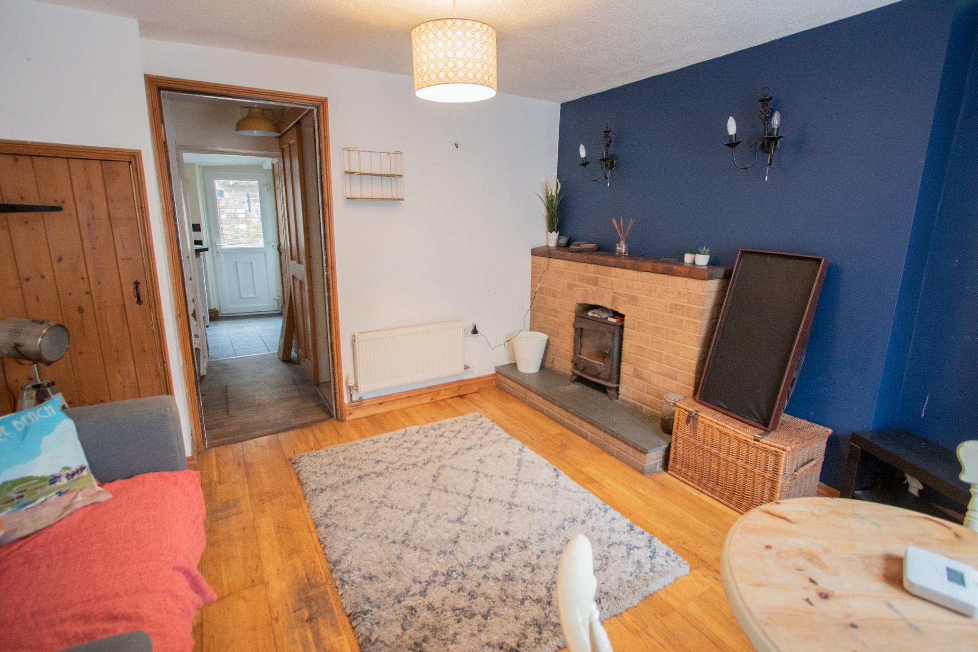 The front door opens into a spacious open-plan living and dining room, featuring an attractive fireplace with a wood-burning stove, creating a warm and welcoming focal point. The ground floor also comprises a fully fitted kitchen and a family bathroom. To the first floor are two comfortable double bedrooms.