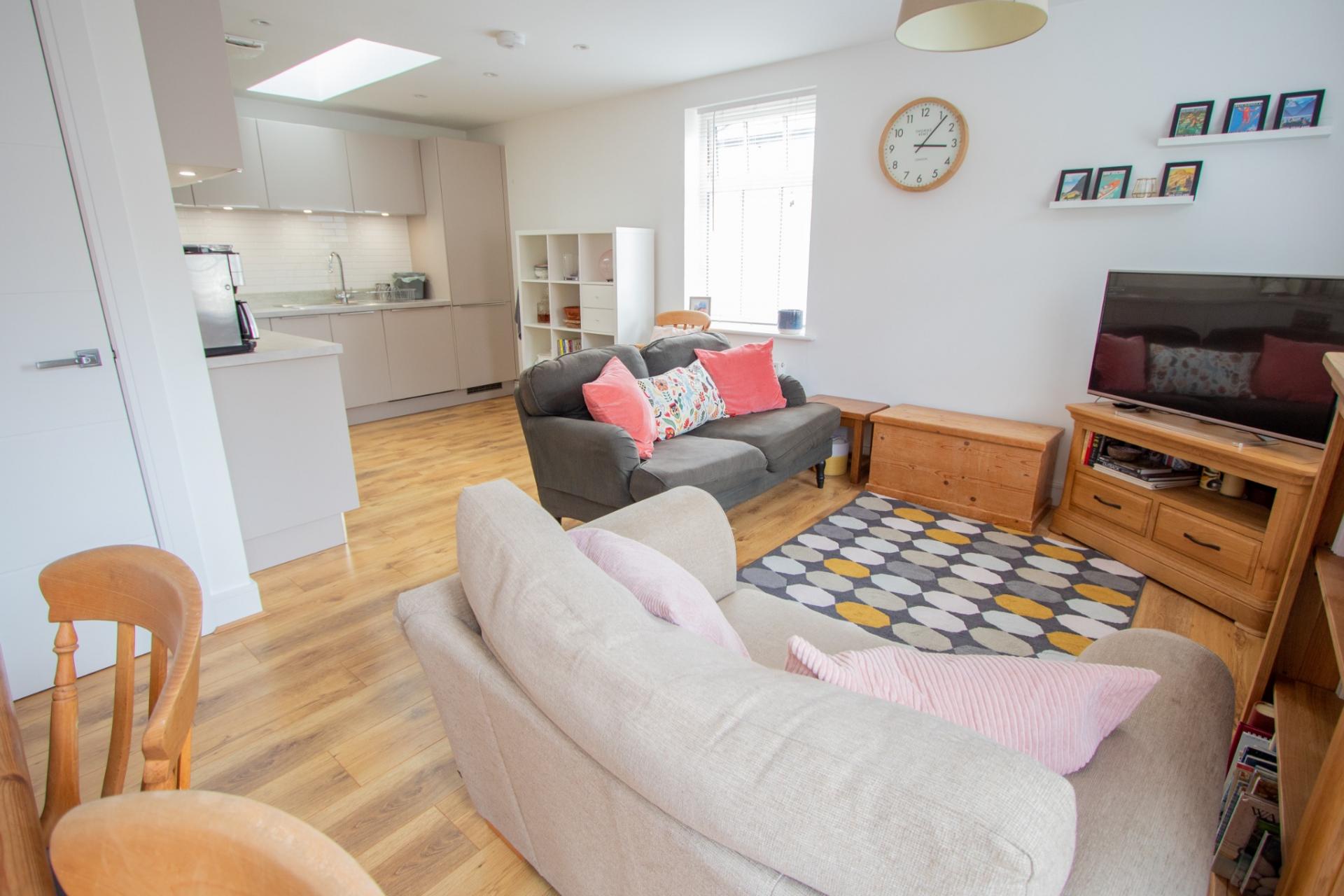 The accommodation comprises: own entrance with staircase rising to the first floor, with spacious landing, cupboard with space and plumbing for washing machine, doors open into a stunning open plan lounge/dining/kitchen, the kitchen area is fitted with a range of matching wall and base units, worktop services, built-in oven and hob with extractor hood over, integrated fridge/freezer, dishwasher, and laminate flooring. The lounge/dining area also has laminate flooring, french doors and Juliet balcony. There are two bedrooms, the master bedroom also with french doors and Juliet balcony.
