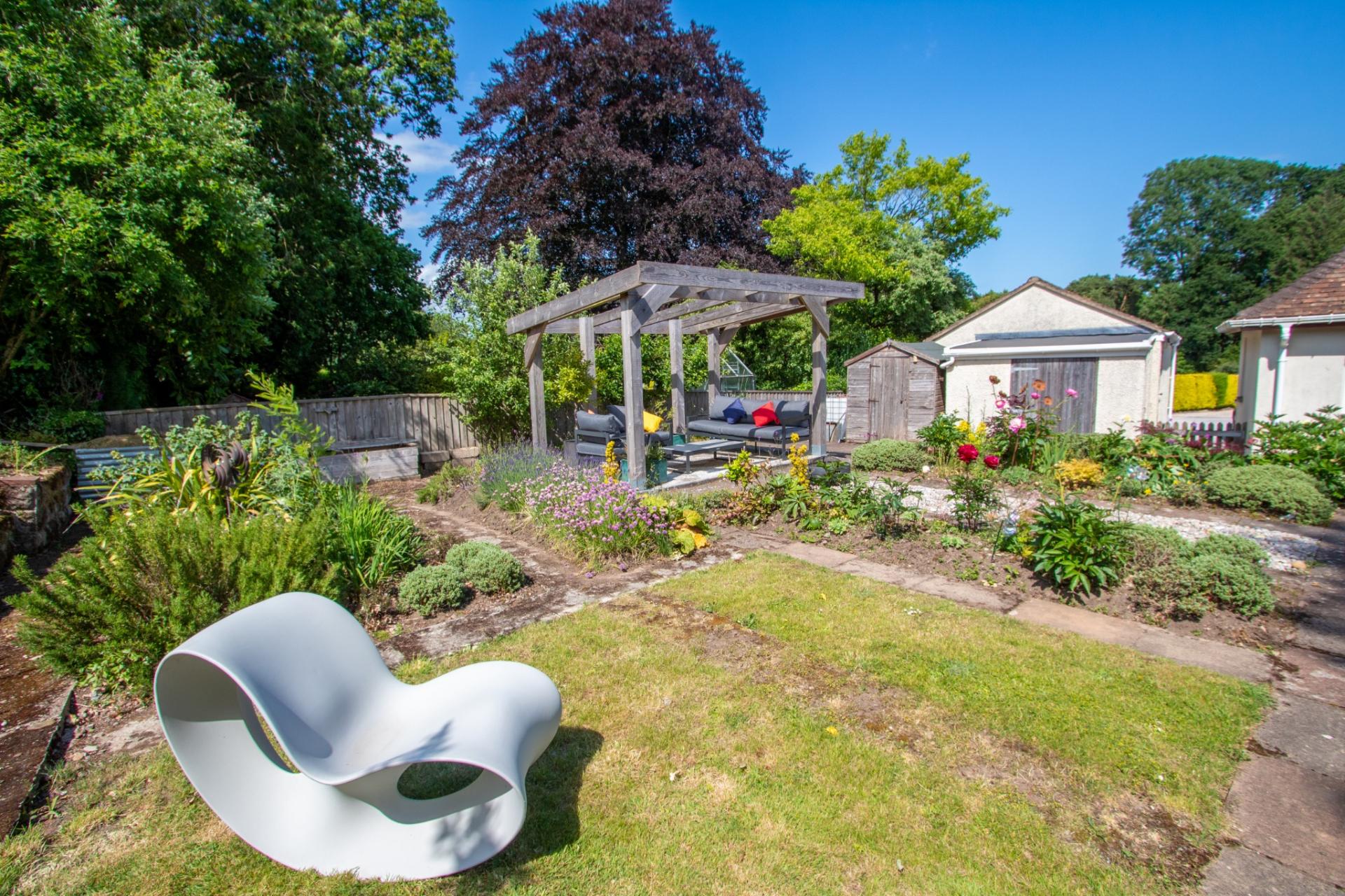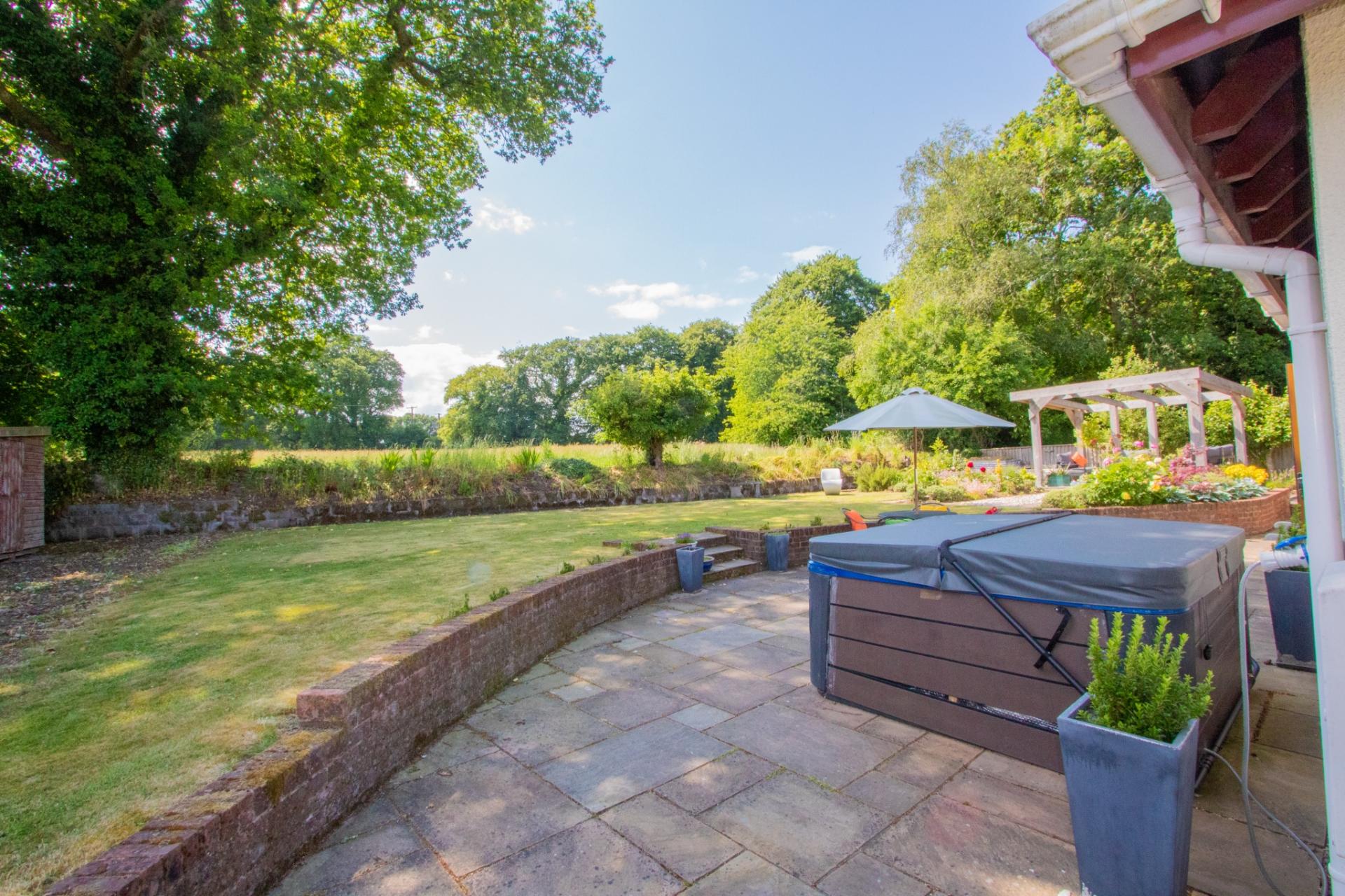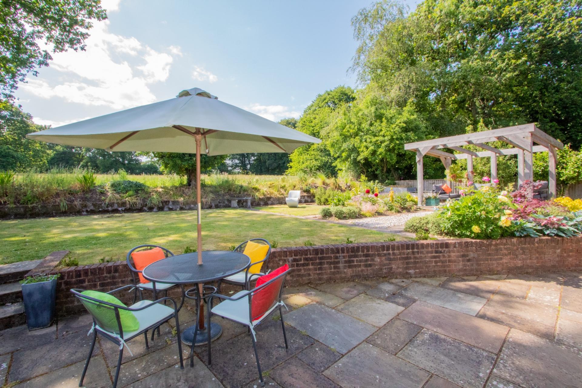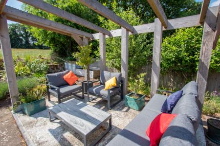 To the rear, a large paved patio creates the perfect space for outdoor entertaining or relaxing, complemented by a charming pergola area—ideal for peaceful afternoons or al fresco dining.