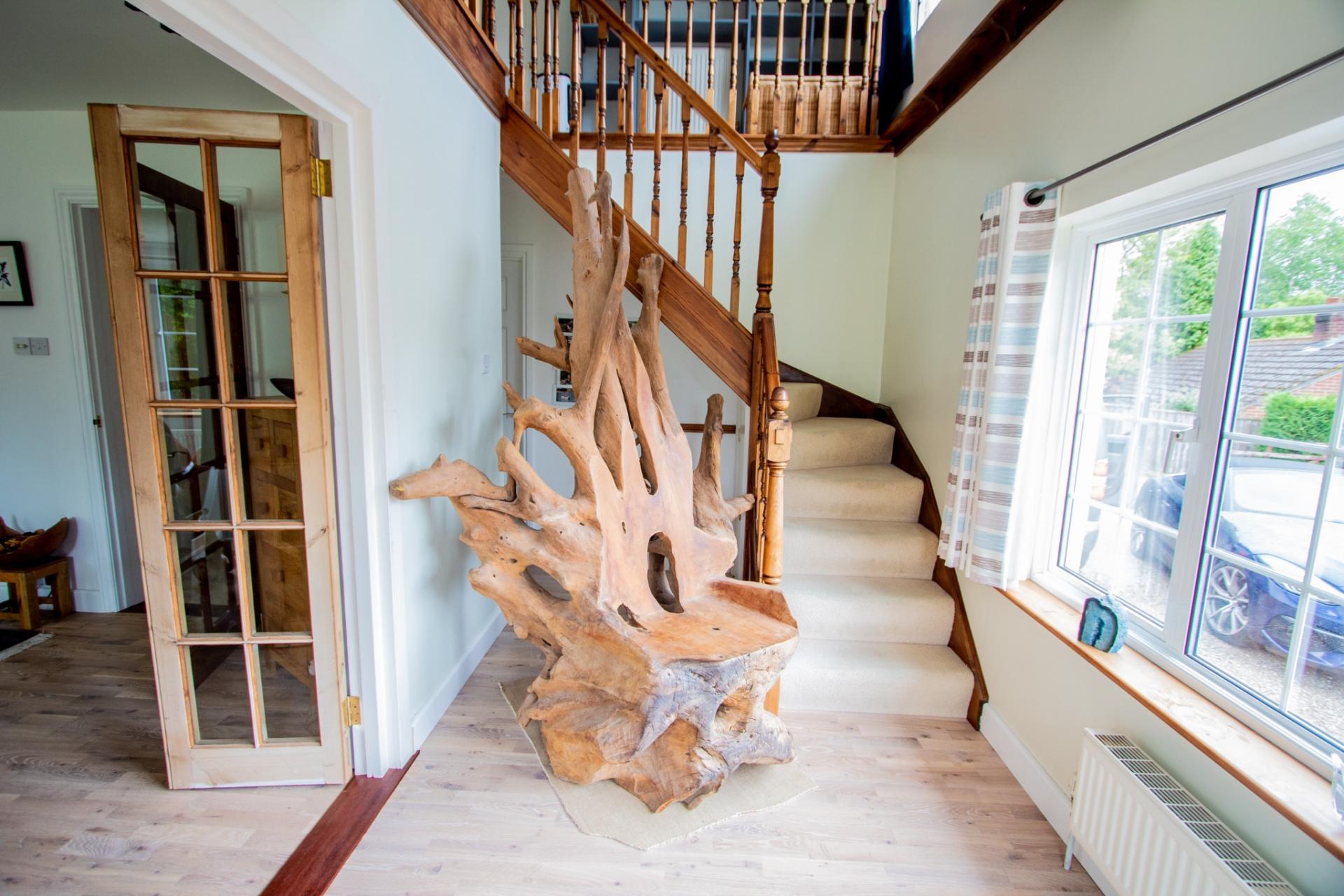 Upstairs, the first floor features a generous master bedroom with views over the side garden and an en-suite shower room. A striking galleried landing adds charm and character to the upper level.