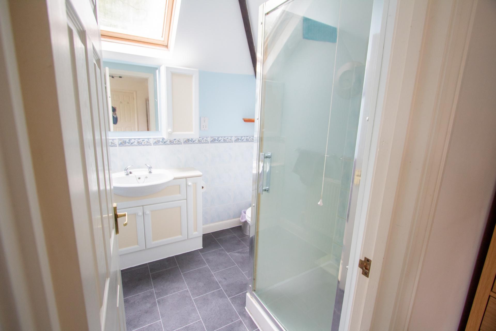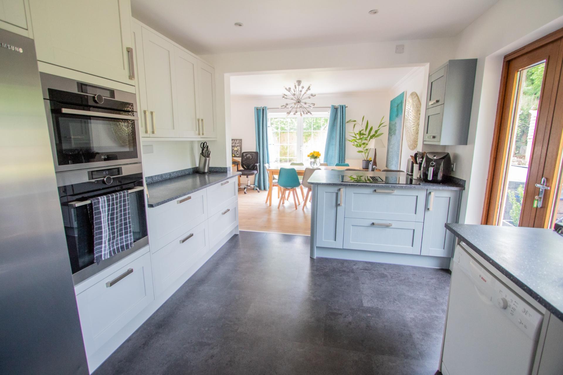 The ground floor offers a large and welcoming entrance hall, leading to a spacious living area that is open plan to a dining room and a beautifully fitted, contemporary kitchen. A utility room and cloakroom are conveniently located just off the kitchen. There are also two well-proportioned bedrooms on this level, along with a family bathroom suite.