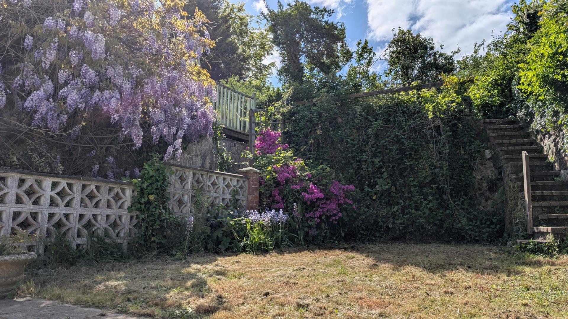 There is a good-sized enclosed rear garden with a patio area and steps up to a lawned area beyond which steps lead to a further area of garden with a small shed and greenhouse.