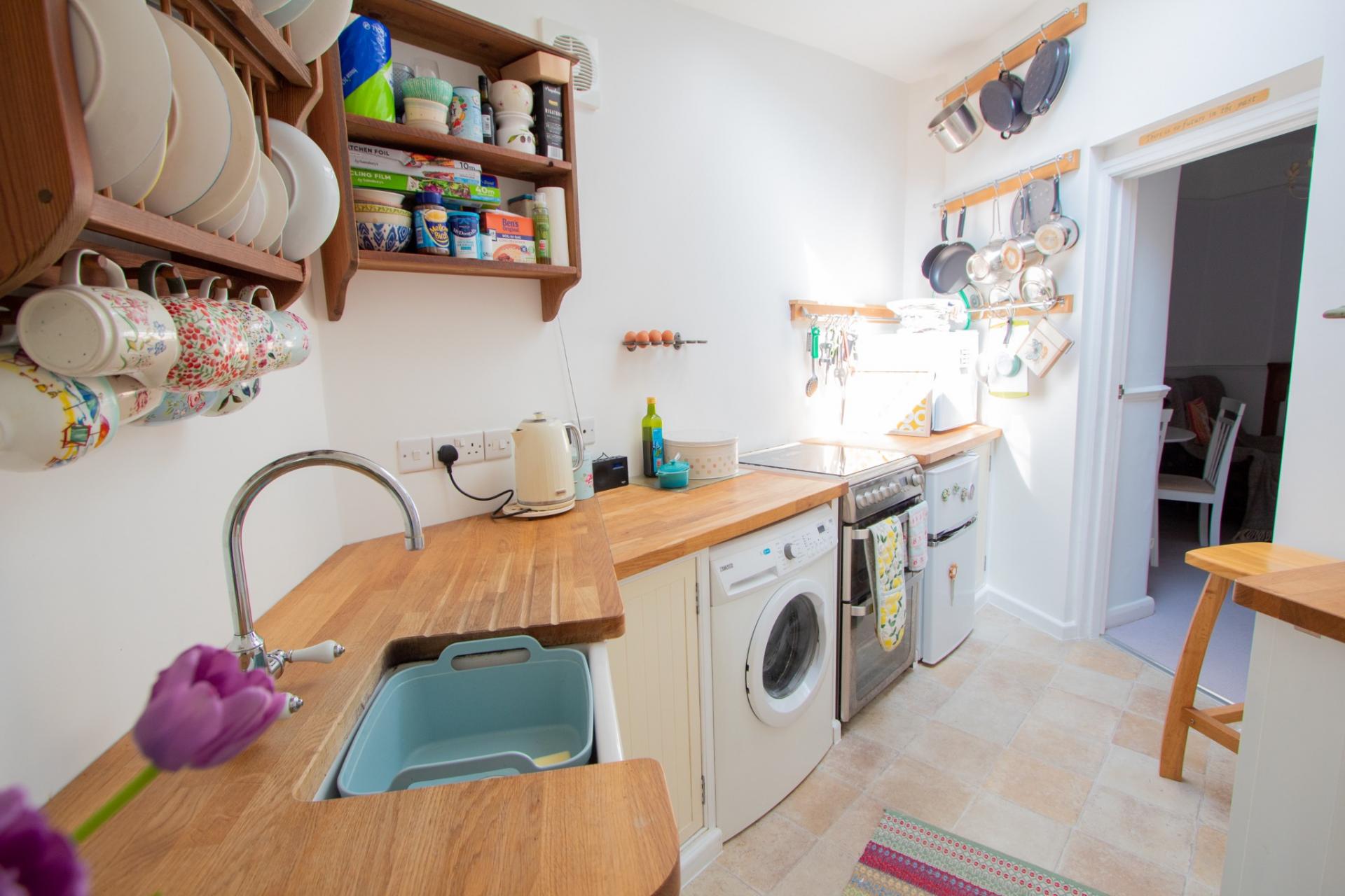 The accommodation comprises: entrance porch with tiled floor, attractive living room, kitchen with a range of units, wooden worktop surfaces, and a bathroom downstairs. On the first floor there are two bedrooms, bedroom one with built-in wardrobes and vanity unit.
