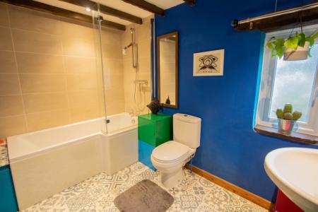 A porch with a courtesy light opens into the living room which overlooks the garden and includes wall lights and a feature fireplace with concealed lighting. The attractively fitted kitchen features modern units with concealed lighting and timber-effect worktops, an integrated oven and gas hob with a filter hood over, tiled flooring and space beneath the staircase for a fridge/freezer. The landing has a hatch with a loft ladder to a large roof space. The double bedroom includes a wardrobe which also houses the gas boiler, and there is an exposed brick chimney breast, shelving and wall lights. The very spacious and well-appointed bathroom features a p-shaped bath with a shower which runs off the boiler.