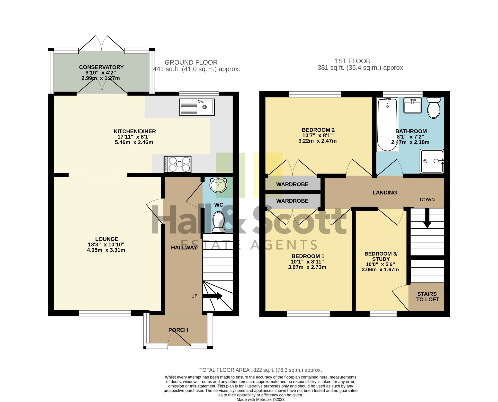 On the first floor there are three bedrooms; the master bedroom with built-in wardrobes, bedroom two also with built-in wardrobes and a lovely bathroom suite with bath, basin, toilet and separate shower cubicle. In bedroom three there is a door which opens into a cupboard with a staircase giving easy access to the loft.
