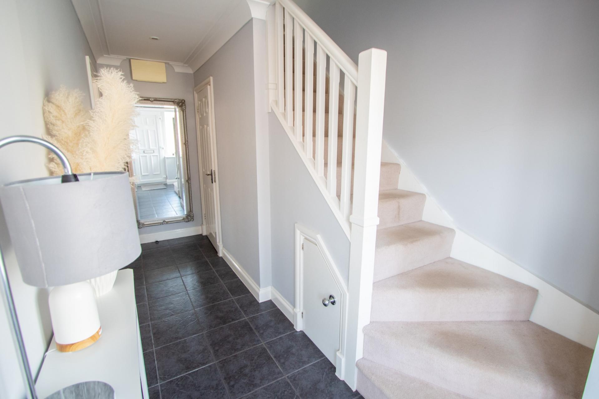 The outside: To the front of the property is a brick paved driveway offering parking with an electric vehicle charging point. Side pedestrian access leads through to the rear garden, which is part paved with lawned garden, shrubs and outside tap.