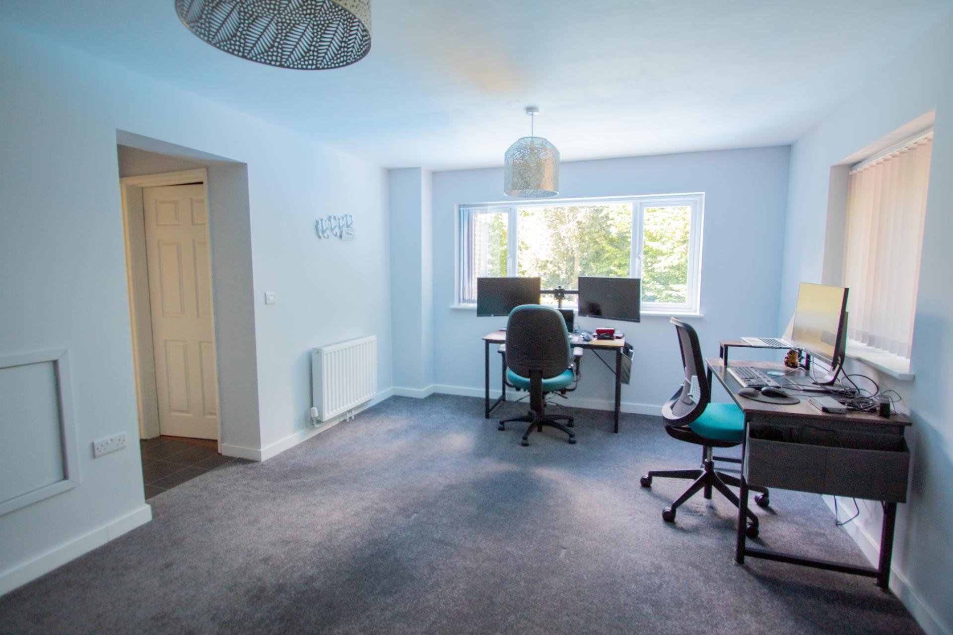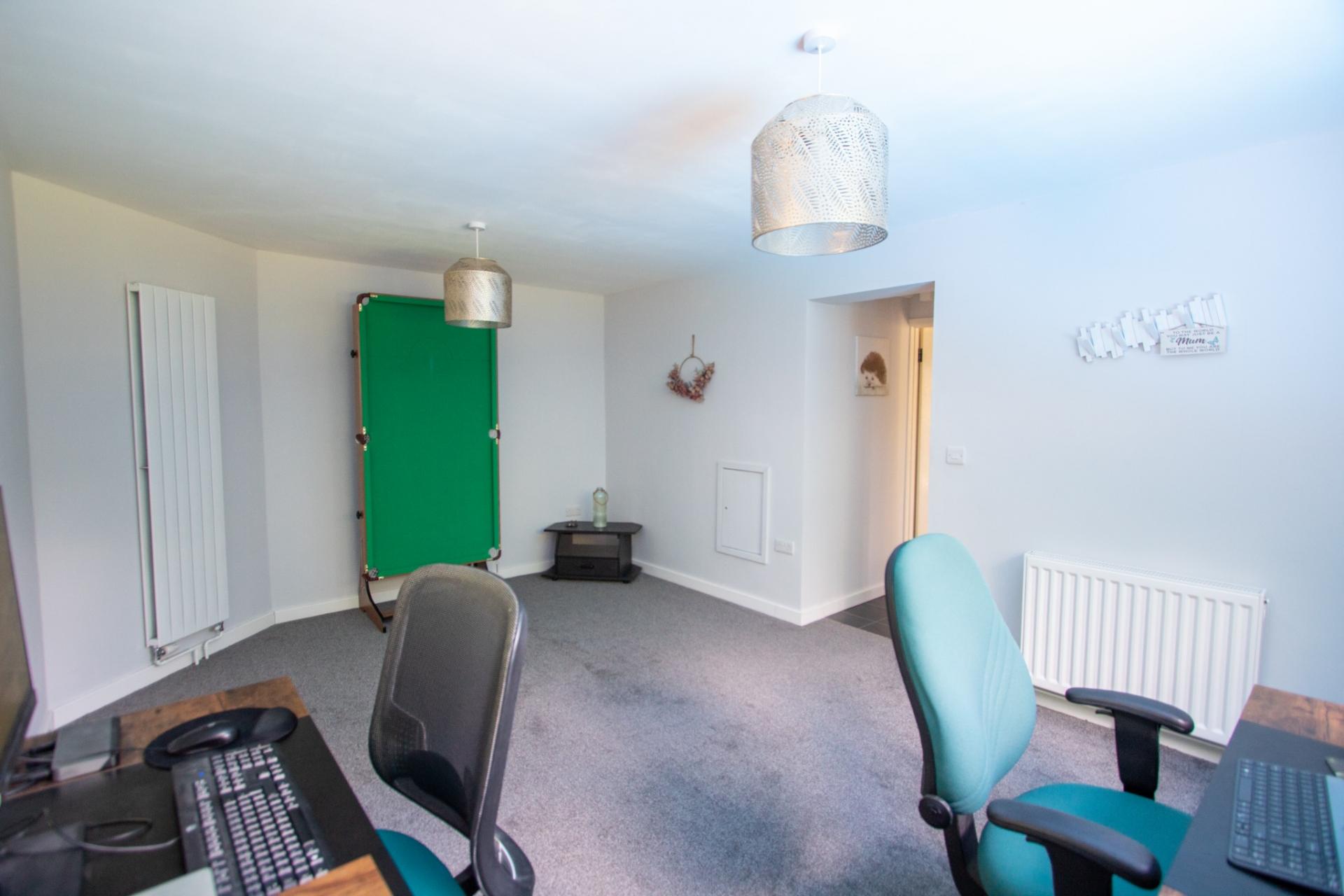 From the kitchen, a door leads to a utility room with space for both a washing machine and tumble dryer and also houses the boiler. Another door opens into a cloakroom and leads through to a superb second reception room – a versatile space enjoying garden views, perfect as a playroom, home office, or snug.