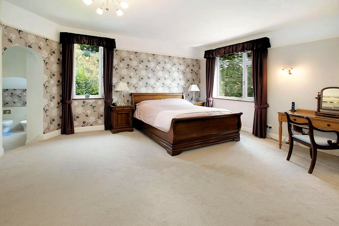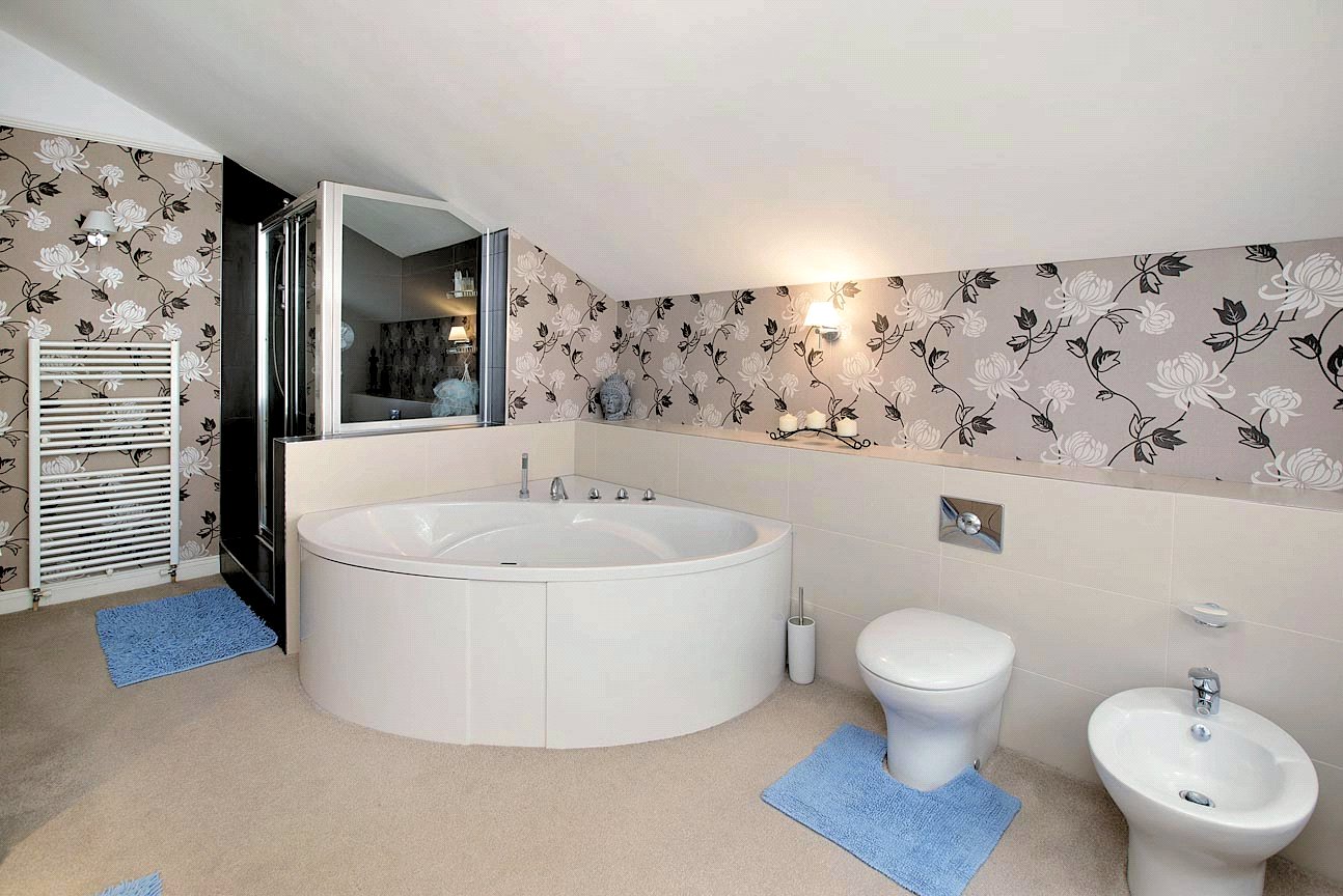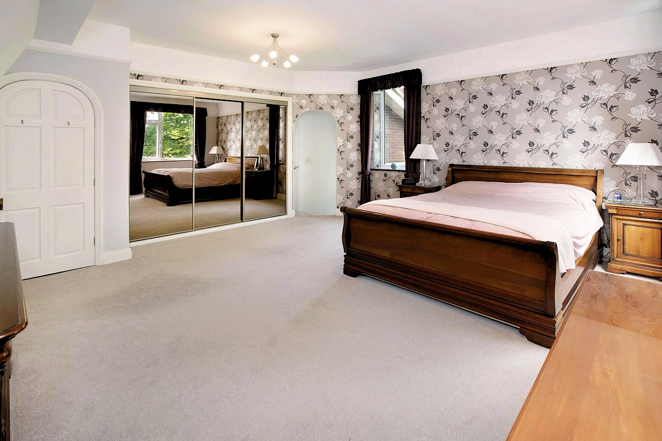 The principal bedroom is a light and spacious room, entered through a distinctive arched doorway and enjoying a dual aspect. A range of mirrored wardrobes offers plenty of storage, while an arched opening and a few steps lead to a generous modern en suite bathroom. This includes twin basins with mixer taps, a deep bath, separate tiled shower enclosure with mains shower, WC, bidet, wall lighting, a large wall mirror, and multiple storage cupboards, including a linen cupboard with slatted shelving.