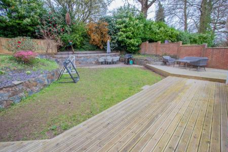 To the front and side is a driveway offering ample parking and leads to a single garage up and over the door. The front garden is laid to lawn, side access to the rear garden with a large timber-decked patio, lawned garden, well stocked with shrubs.