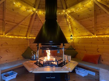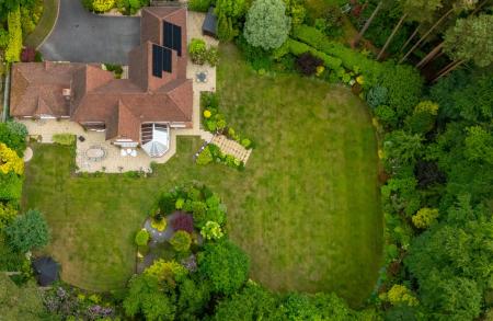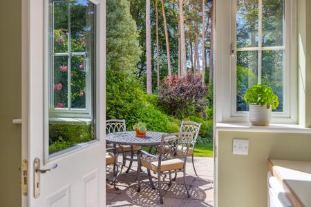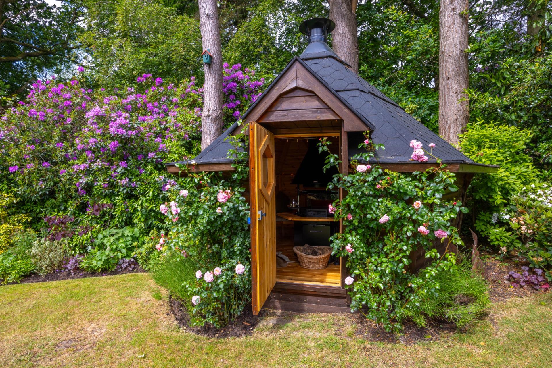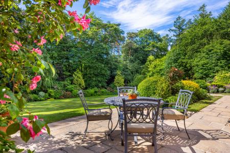 The outdoor space includes two-level patios connected by a paved pathway, extensive lawned areas that gently slope down to the woodland, and well-planted borders filled with a variety of trees, shrubs, and plants. A tranquil Japanese garden adds a touch of elegance, while a charming BBQ lodge provides a perfect year-round entertaining space, comfortably seating 12 to 15 guests.