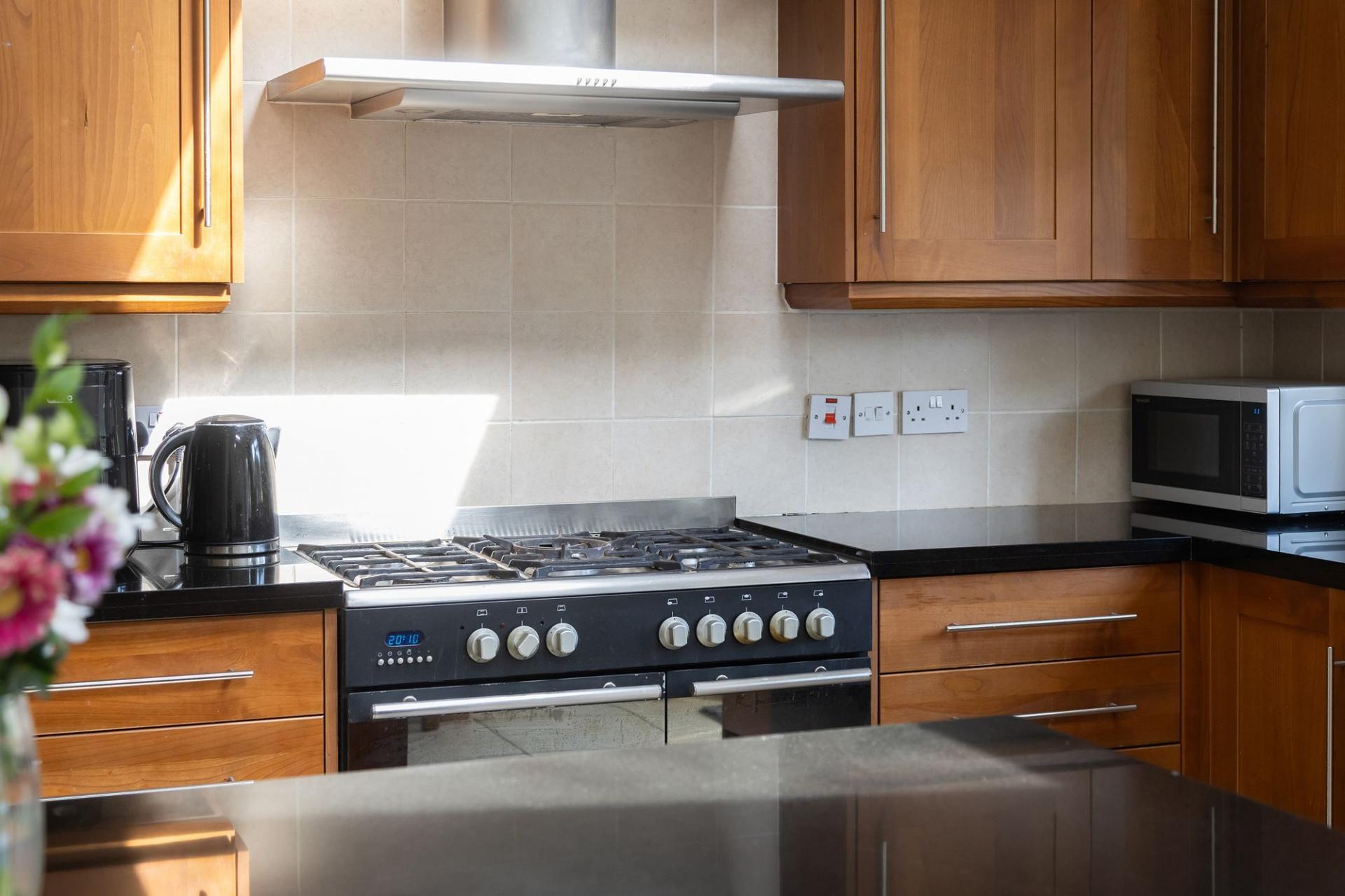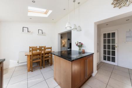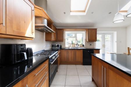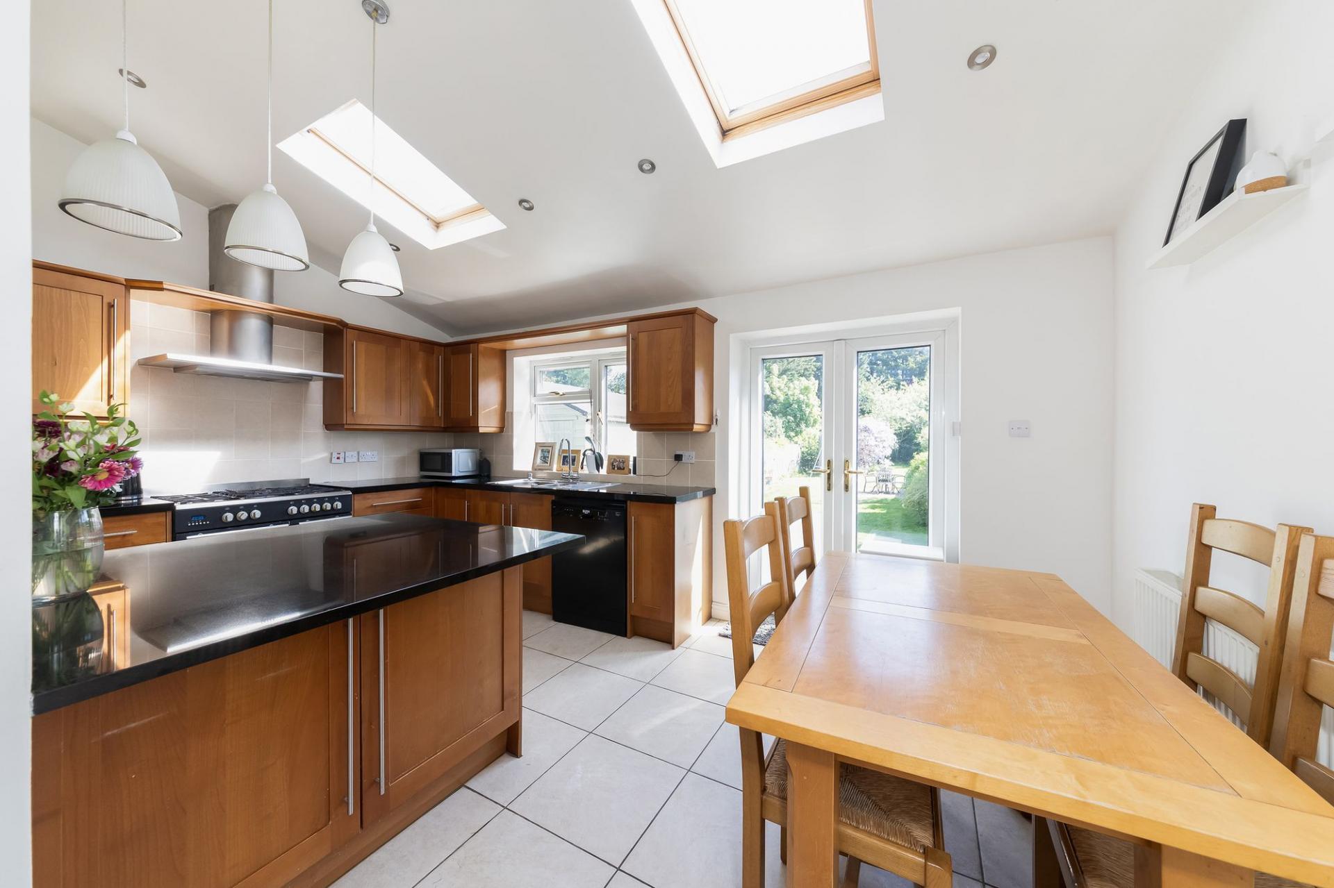 - Well fitted kitchen with breakfast bar, space for Range cooker and generous storage. The glazed French doors, window and pair of skylights ensure the room is flooded with natural light