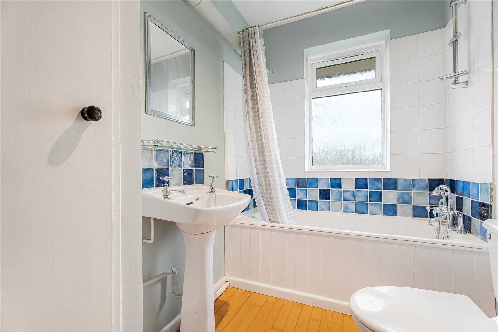 There are two bedrooms, including a generous principal bedroom with built-in storage and a second bedroom which could also serve as a study or guest room. A family bathroom is positioned off the hall between the bedrooms.