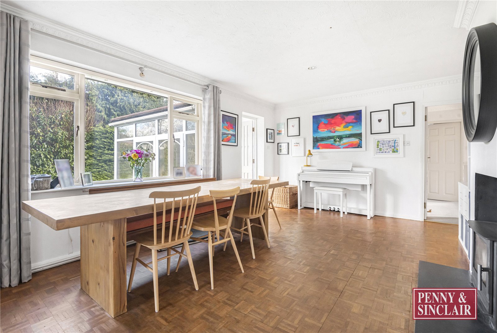 The entrance hall opens into a beautifully proportioned sitting room, featuring a dual aspect and French doors that lead out to the terrace. leading off is an impressive dining room, complete with a gas fire and feature surround, while steps lead down to a charming garden room with double doors opening onto the stunning rear garden.