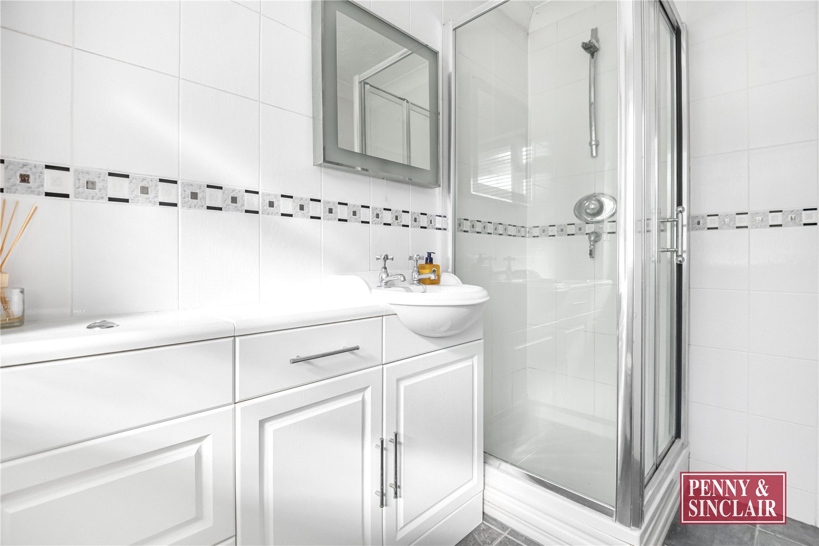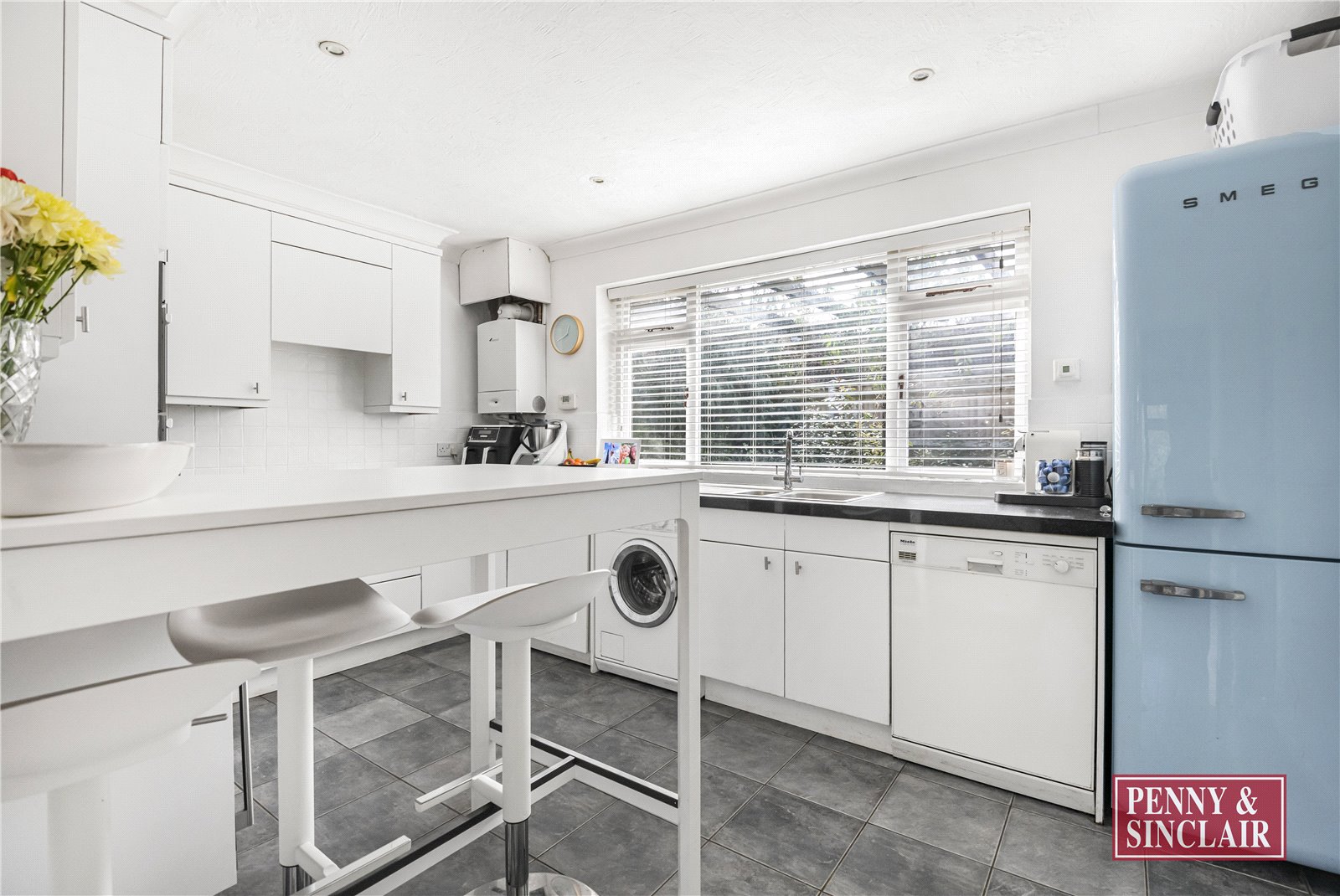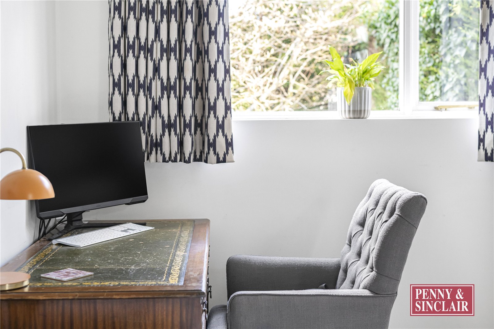 The kitchen/breakfast room enjoys a bright, front-facing aspect and has been refitted by the current owners to include underfloor heating and a wine fridge. A separate study, also positioned at the front, provides a dedicated workspace. Off the hallway, there is a shower room with a white suite, as well as a further well-presented bathroom with white sanitary ware and under floor heating.