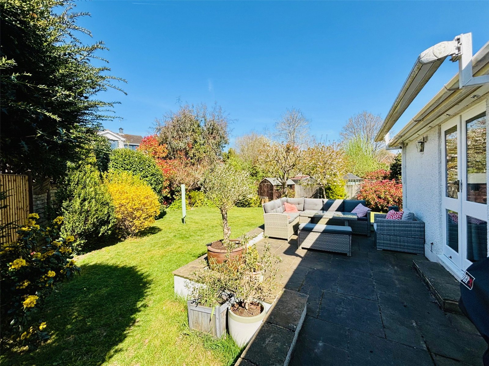 The beautifully landscaped rear garden boasts a generous lawn surrounded by well-established, meticulously stocked borders. A fabulous terrace, complete with an electric awning and integrated lighting, offers the perfect space for outdoor relaxation, while a well-sized shed provides convenient storage.