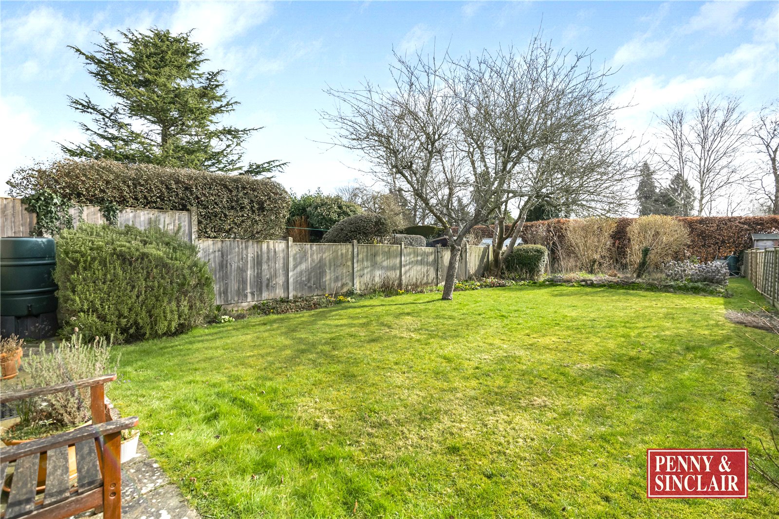The entrance hall leads into a lovely, light-filled living and dining area, extended to enhance the space and featuring a gas fire with a back boiler. The adjoining kitchen is well-proportioned and provides access to an excellent garage at the side, offering further storage or potential for conversion (subject to planning).
