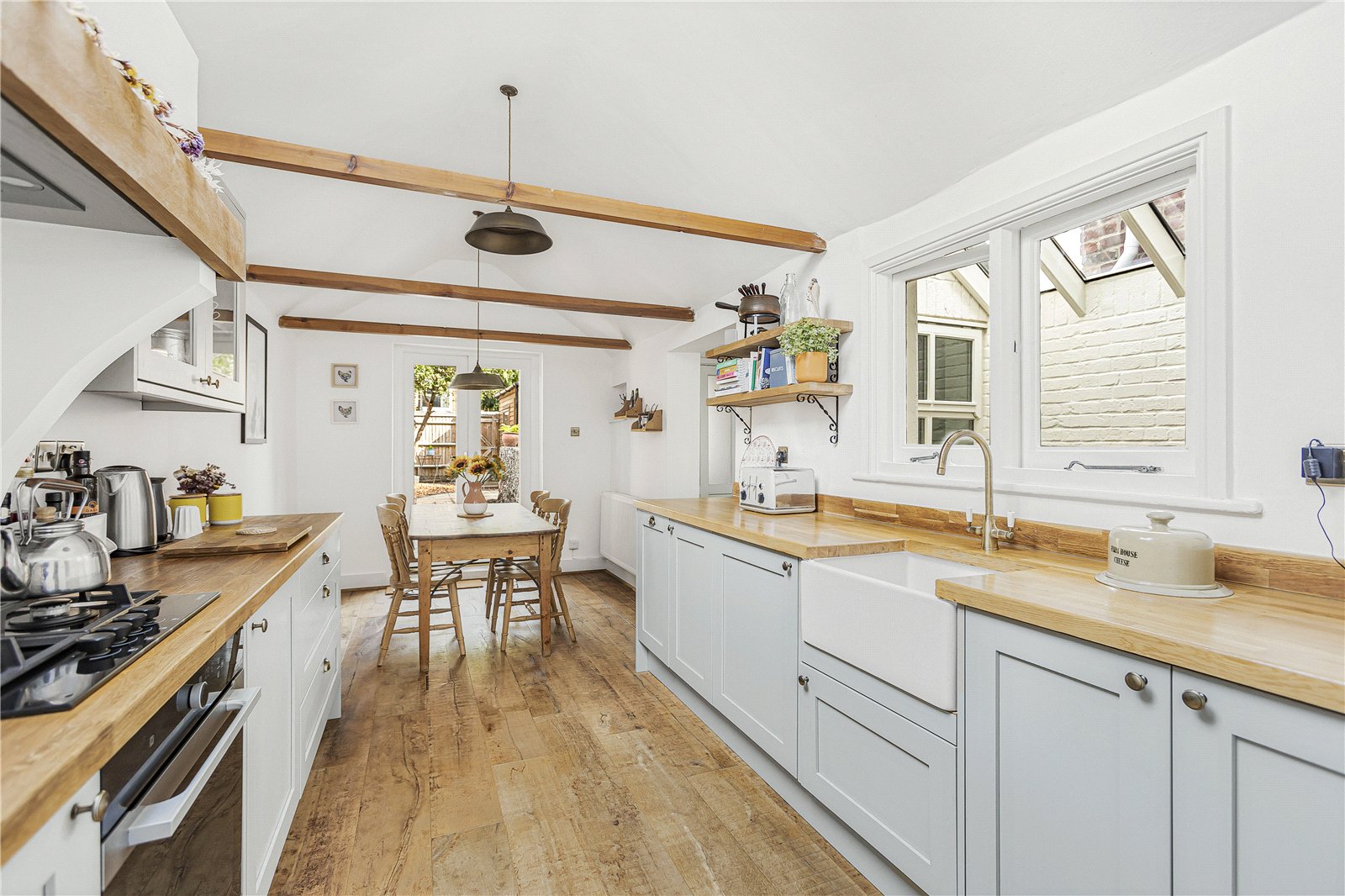 On the ground floor the accommodation consists of primary reception with bay window to front. This warm and welcoming room also has the added bonus of a wood burning stove and a huge amount of natural light. Across the hall leads to the second reception, also with a wood burner. This room could, if desired, be used as a formal dining room. A bright sunroom sits to the right, and this could be used an additional snug or study. A well-equipped and recently installed kitchen follows, with gas hob, integrated oven and Belfast sink. This room is very bright, and a vaulted ceiling adds to the feelings of space. To the rear of the kitchen is a dining area with double doors to the garden. There is also a very useful utility area off the kitchen with space for a washing machine and tumble dryer, as well as a wet room.