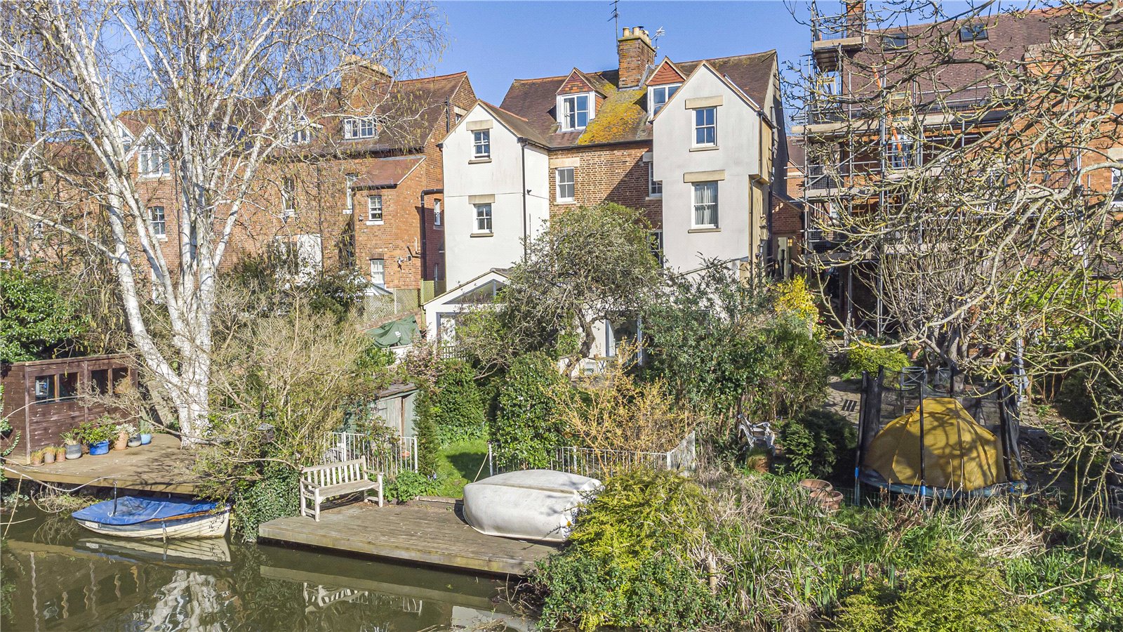 To the exterior, the west-facing garden is mainly laid to lawn with a terrace seating area, perfect for al fresco dining in the warmer months. The garden leads down to the Oxford canal with a pleasant wooden deck offering waterside views and boat access.