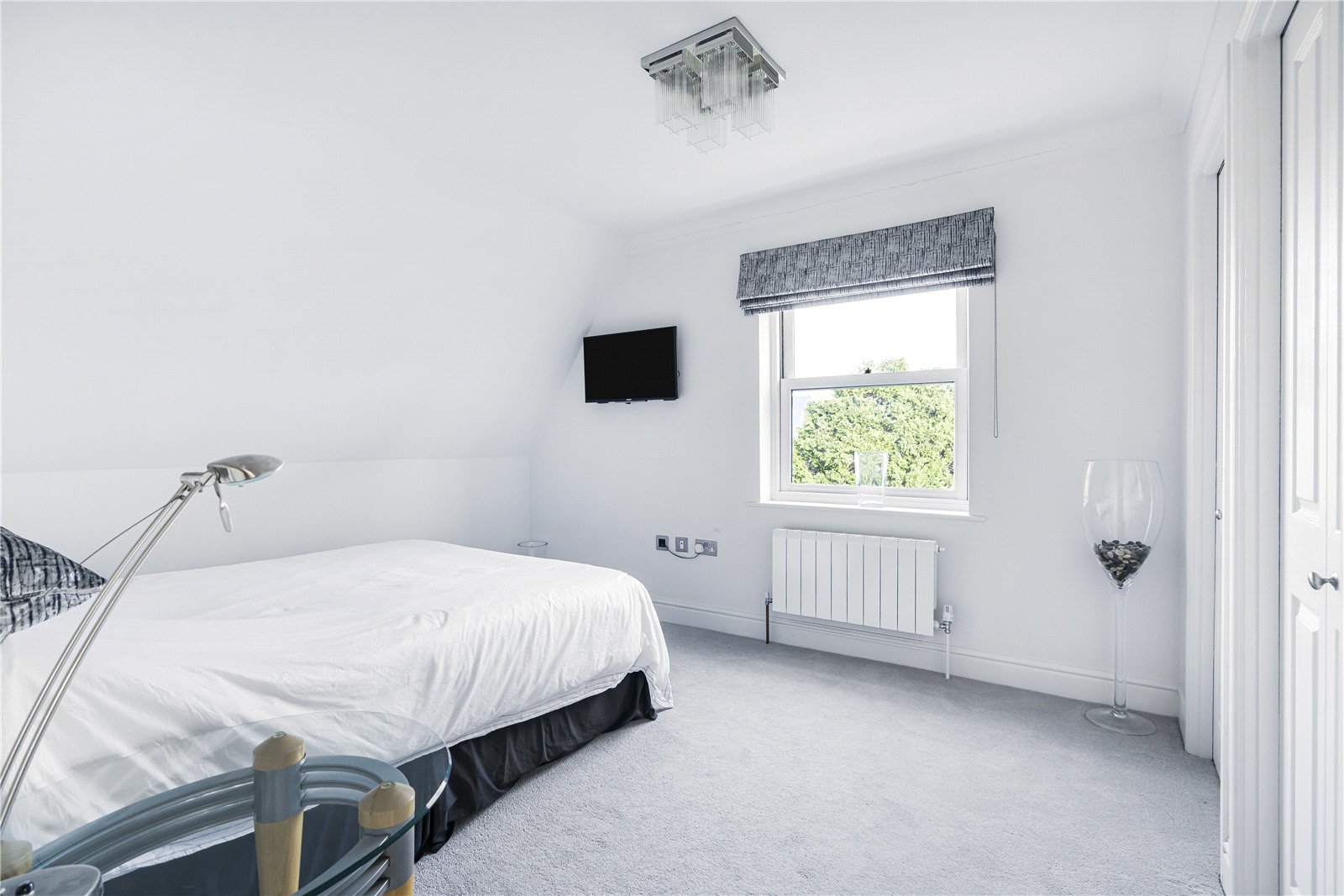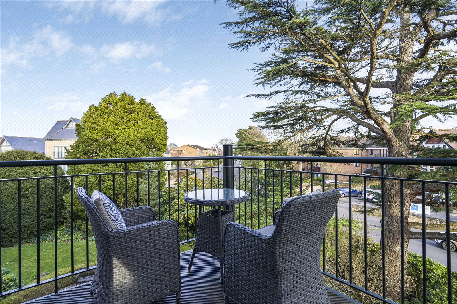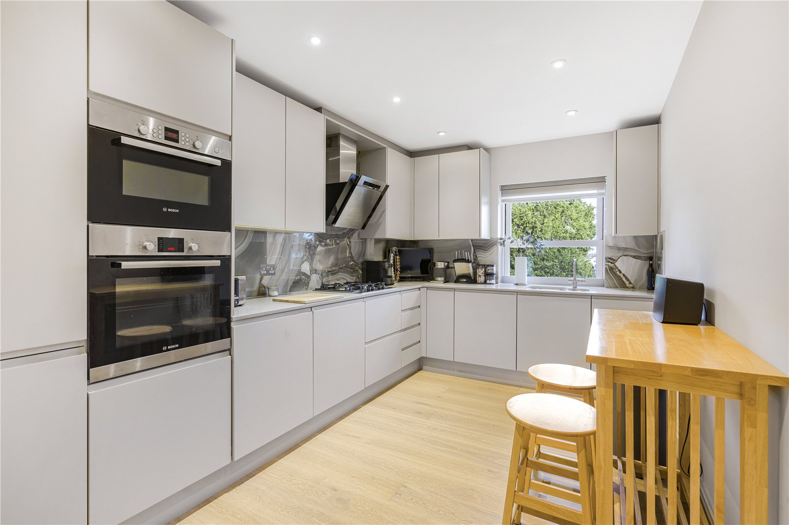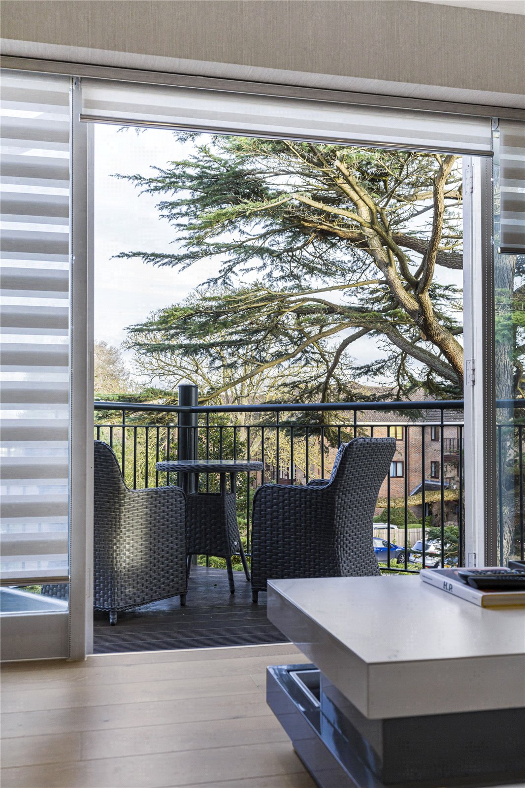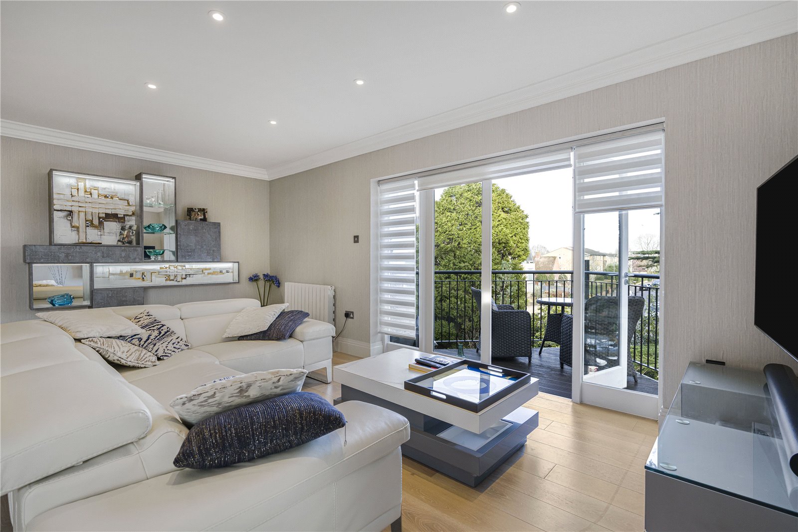 The large living room/dining room features dual aspect south -east facing windows so is flooded with natural light and the covered decked balcony offers attractive views and is the perfect spot for al fresco dining. There is also high quality wood flooring throughout the ground floor.