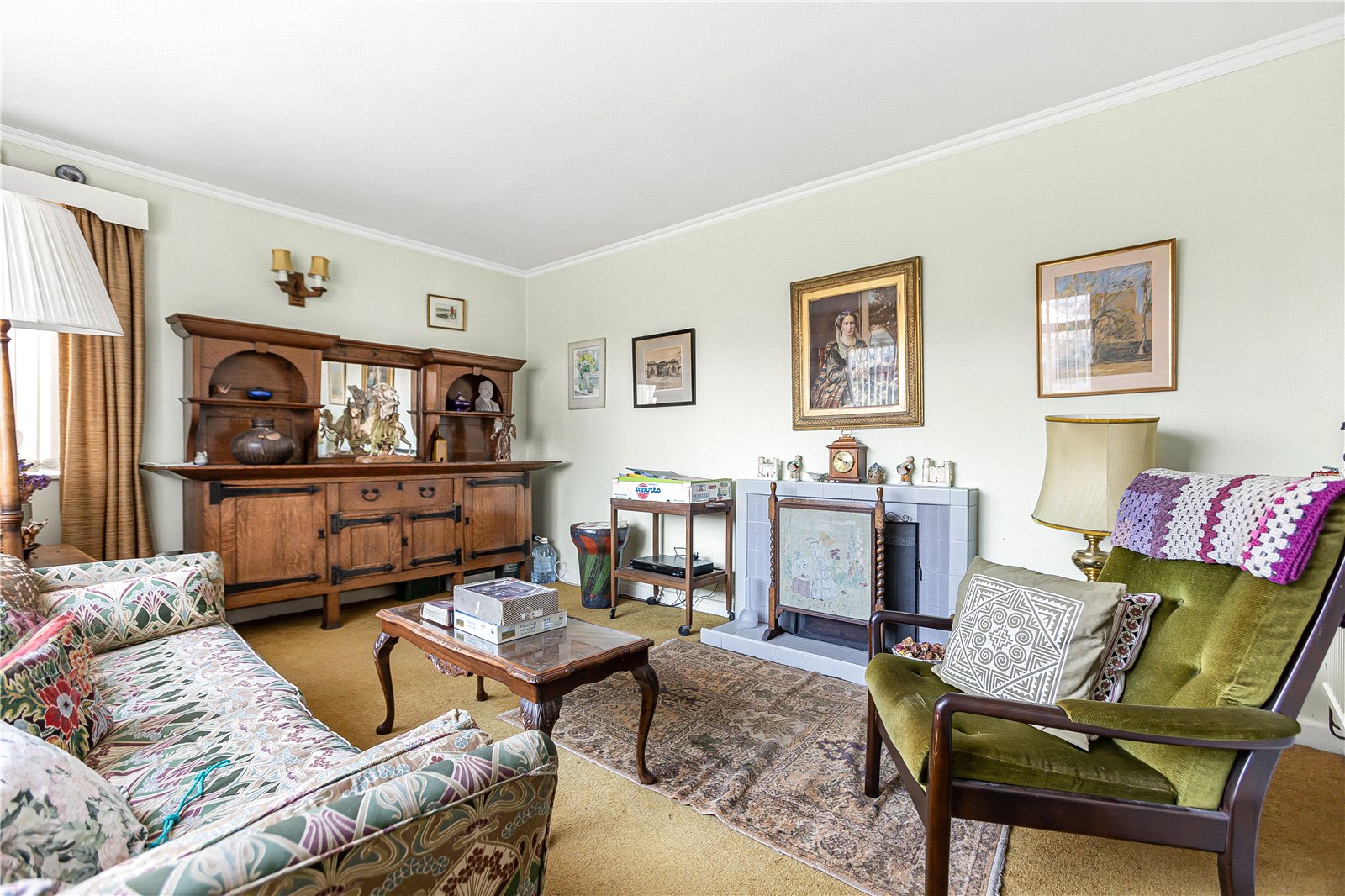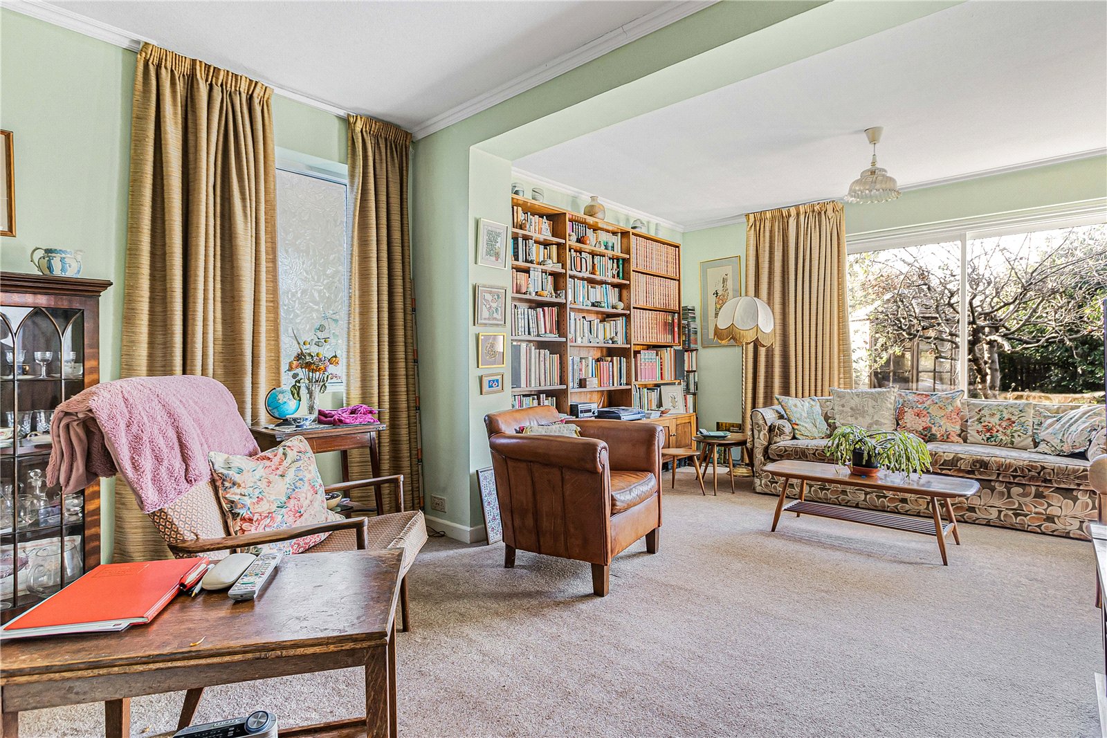 A welcoming hallway leads to a spacious sitting room, a rear living room with garden access, and a central dining room. The kitchen offers practical space with potential for updating, and a downstairs W.C. completes the ground floor.