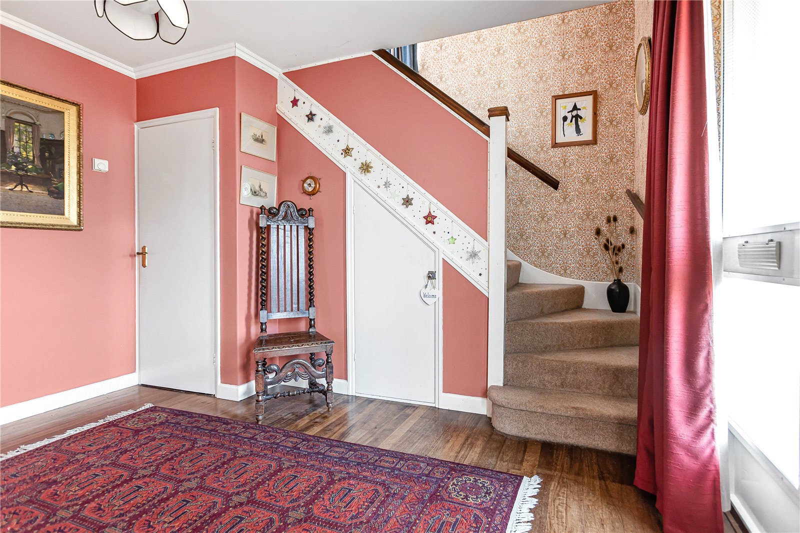 The west-facing rear garden has a paved terrace adjacent to the house, offering the perfect space for al fresco dining in the warmer months. Beyond, the lawn is surrounded by varied planting, mature trees, and shrubs, creating a private and peaceful space.