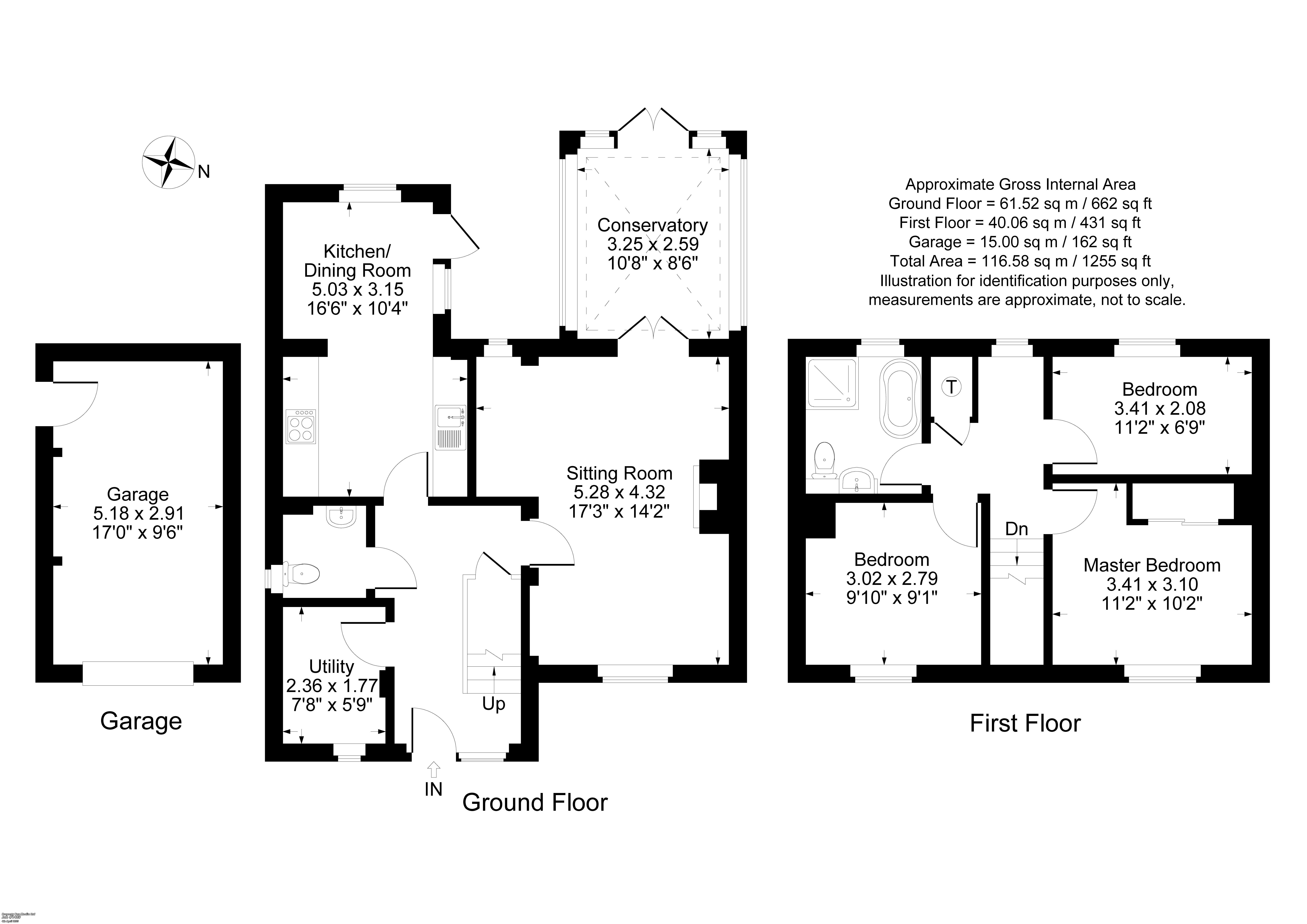 Own gravel driveway with parking for two large family vehicles leading to a garage with up and over door, light and power connected, storage space in a boarded loft area. Door to rear garden.