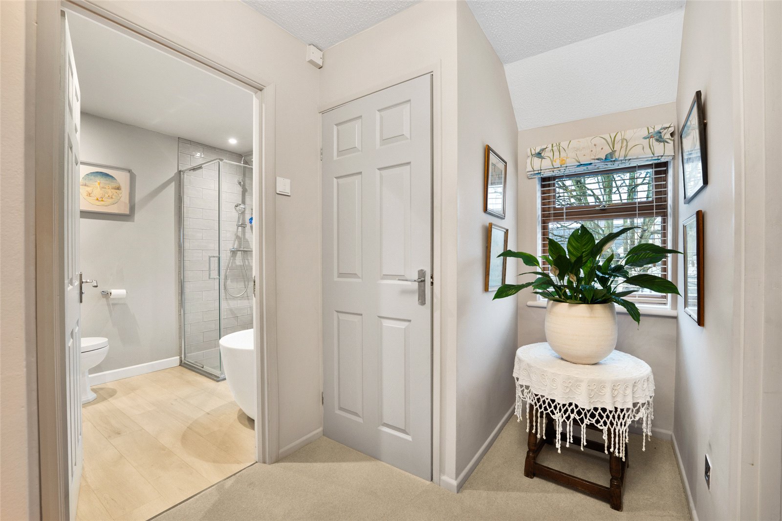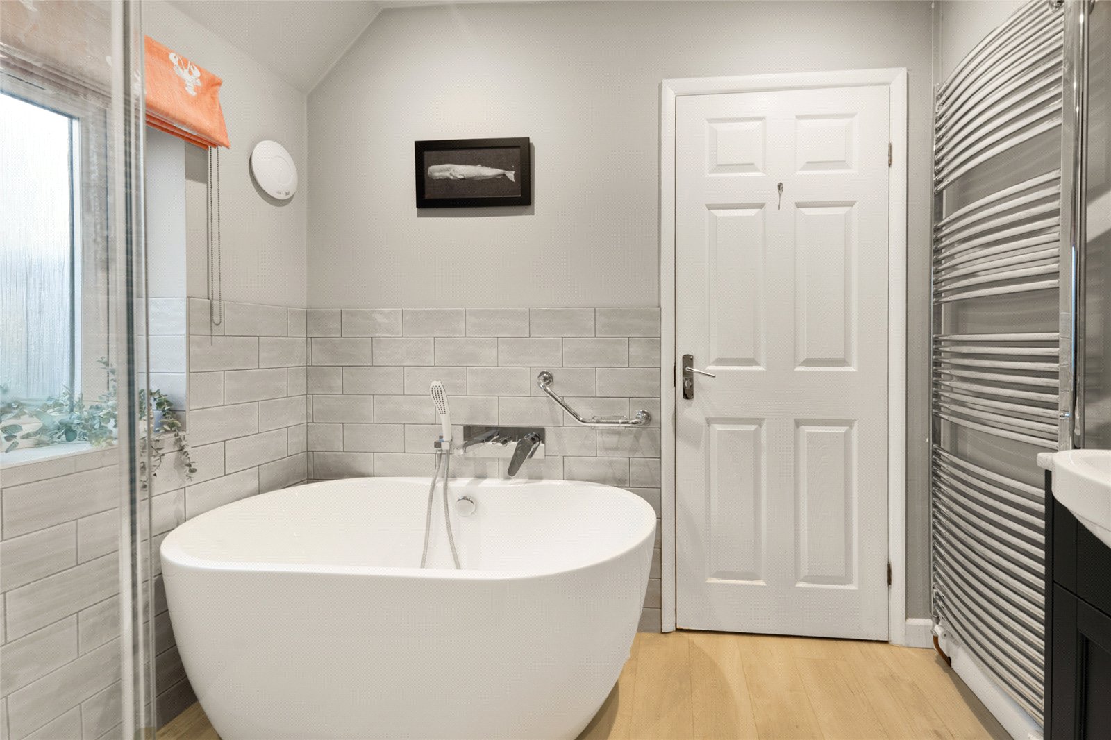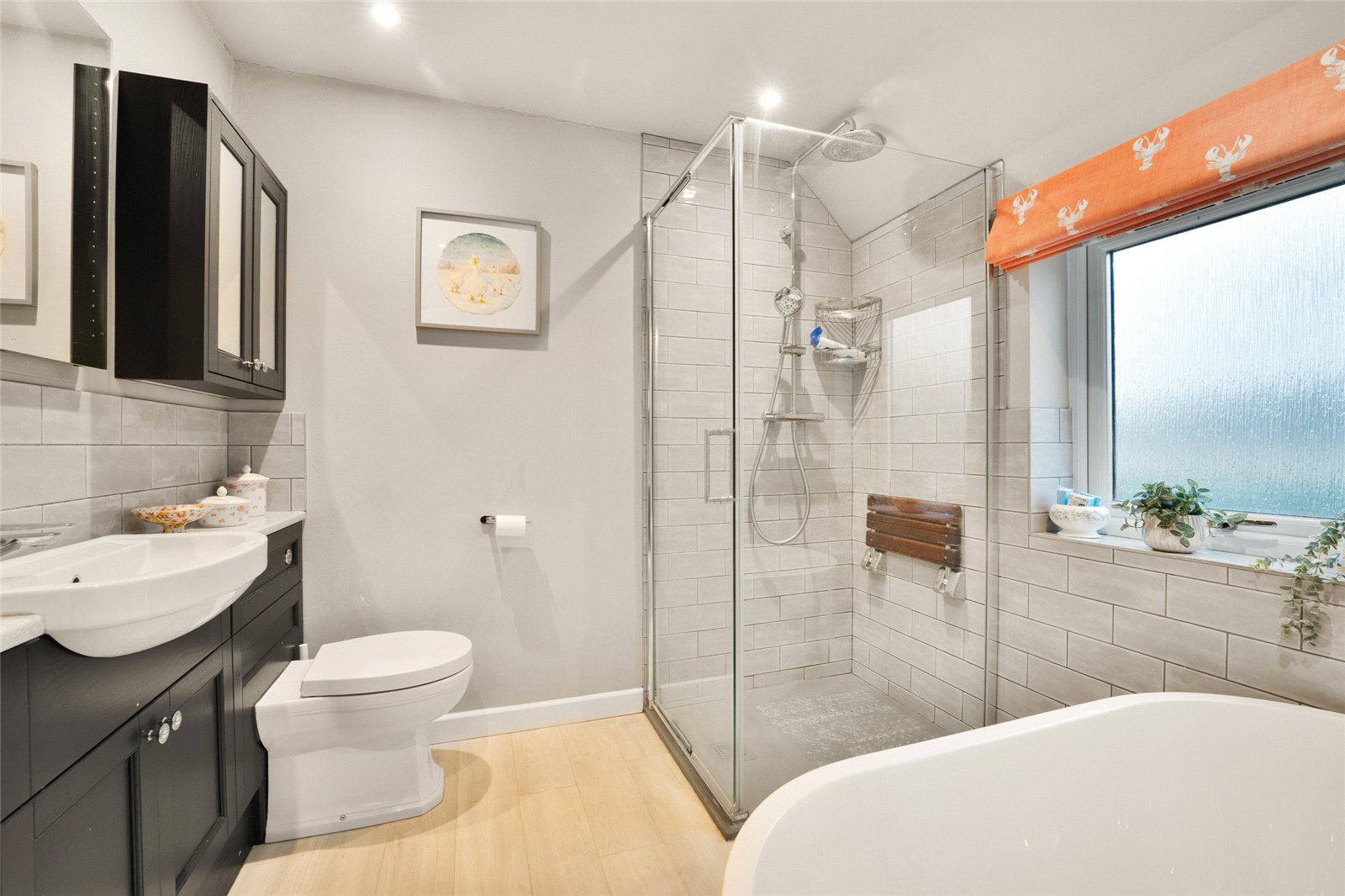 Family Bathroom: Comprising of white suite of free standing oval bath with mixer shower over. Separate walk-in shower cubicle with rain and mixer shower over, hand wash basin with vanity unit below, low level WC, part tiled walls, double glazed window to rear aspect.