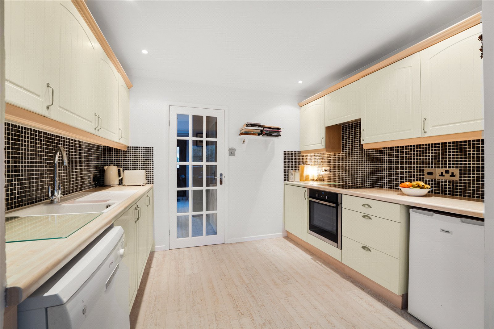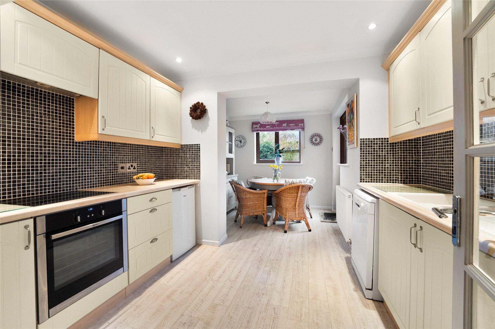 Kitchen/Dining Room: Fitted with one and a half bowel sink, range of mounted wall and base units with worksurface, part tiled walls, built-in electric hob with extractor hood above and oven below, plumbing for dishwasher. Double glazed window to rear aspect, double glazed window and door to rear garden.