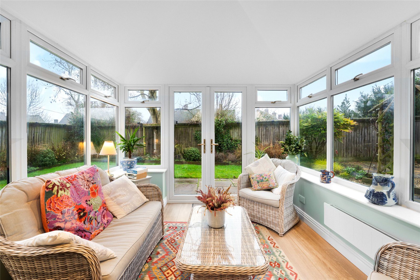 Conservatory: Of brick and double glazed construction with electric radiator. Double glazed french doors to secluded and private rear garden.