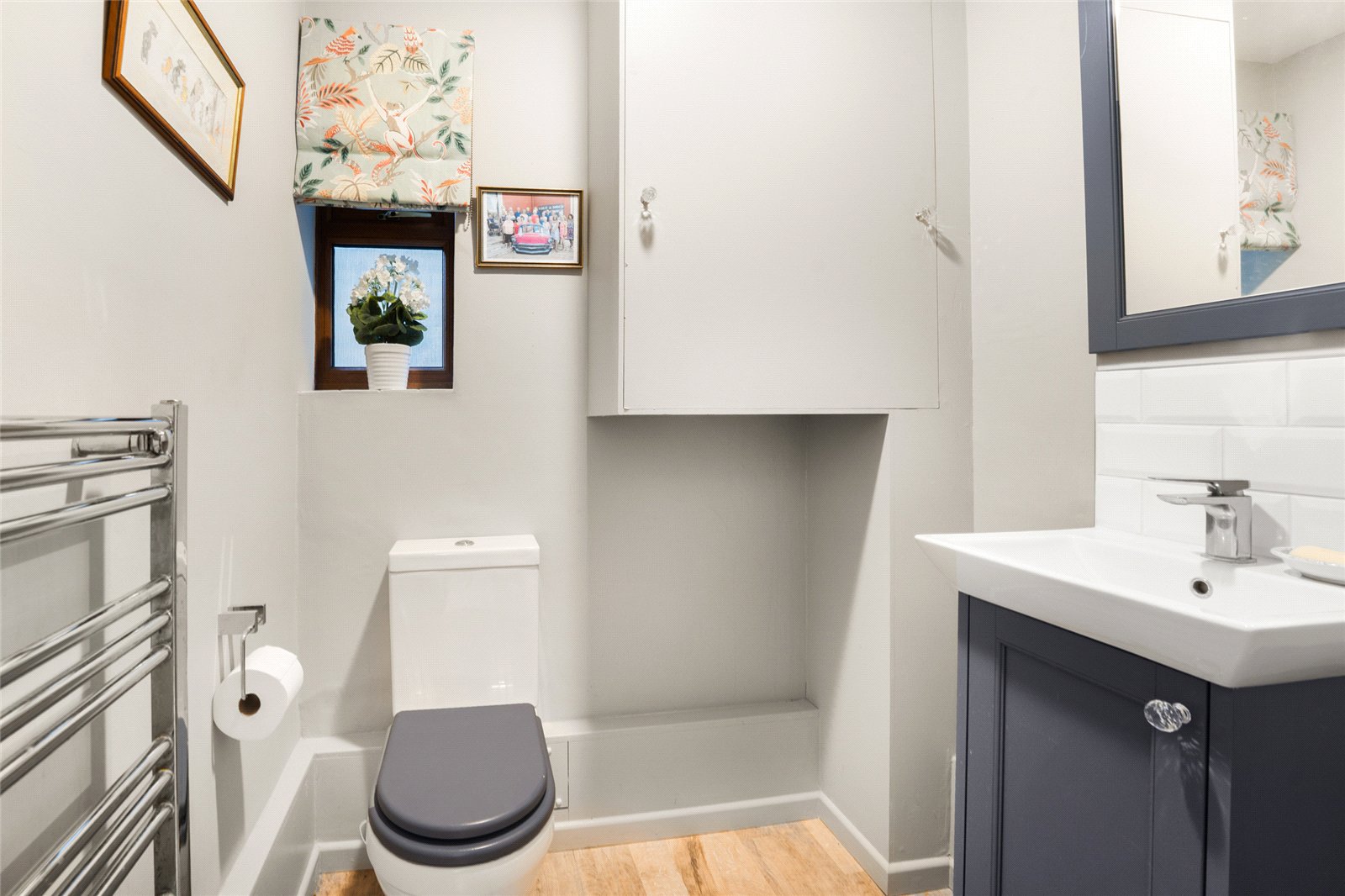 Cloakroom: Comprising of white suite of low level WC, hand wash basin with vanity unit below, part tiled walls, double glazed window to side aspect, towel rail, wall mounted oil central heating boiler.