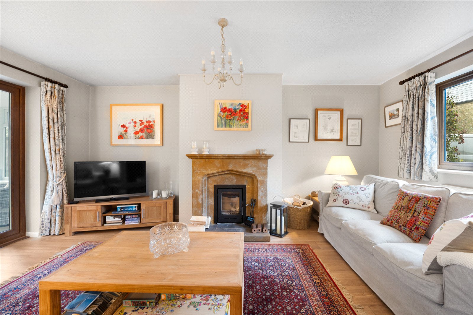 Sitting Room: Attractive stone fireplace with wood burning stove, double glazed window to front aspect, double glazed french doors to