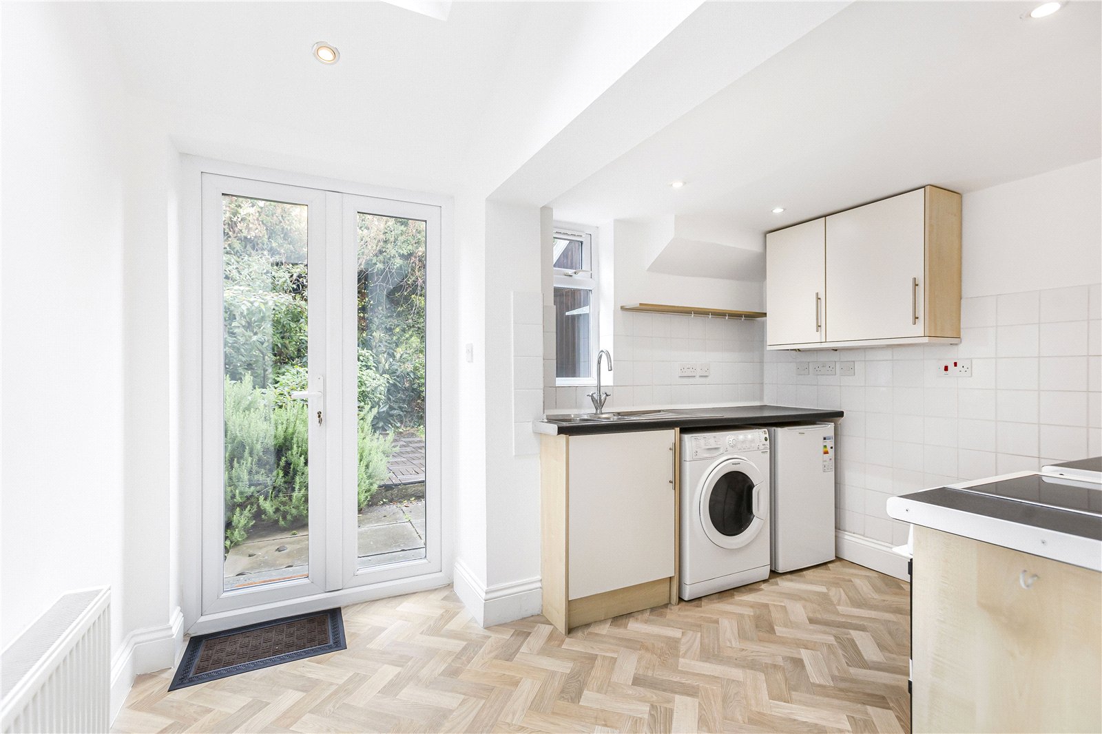 At the rear is the kitchen, fitted with modern units and worktops, offering plenty of storage and preparation space. A rear door leads out to a neat garden, complete with a small shed, perfect for storing bikes or gardening tools.