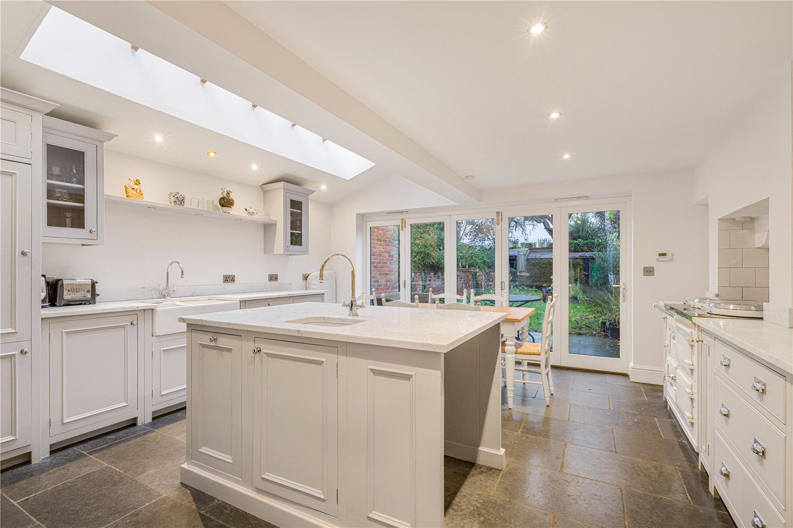 The front door opens to the welcoming entrance hall, leading to the sitting room at the front, which opens to the study with fireplace. Steps lead to the beautifully presented kitchen/breakfast room which features bi-fold doors to the garden and AGA.