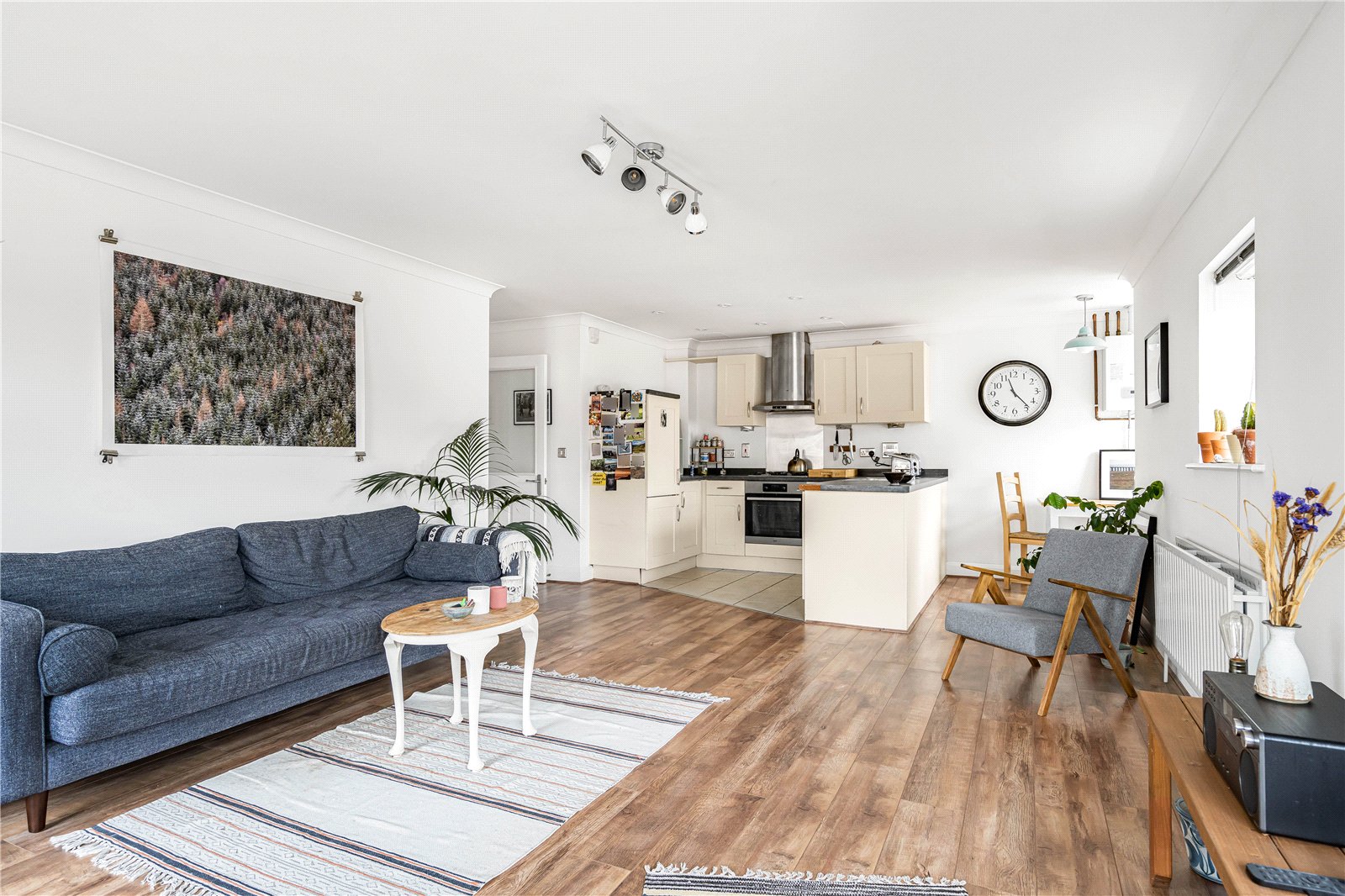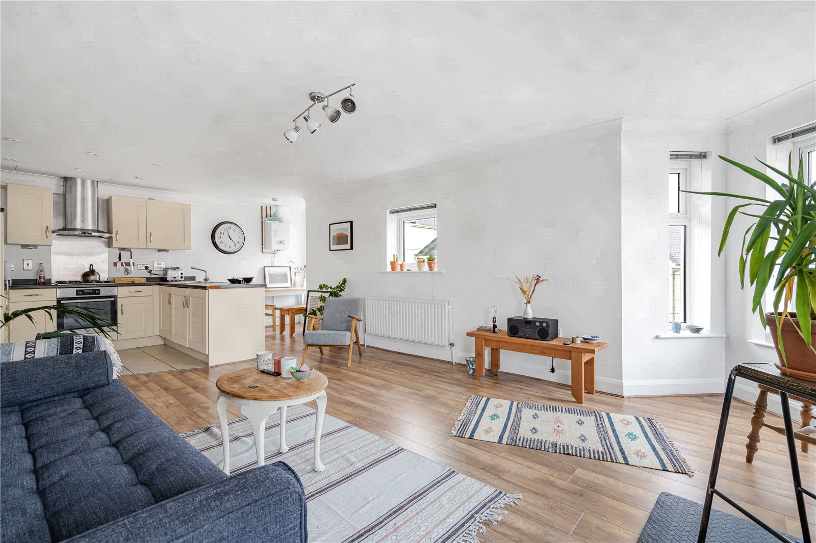 The accommodation briefly consists of entrance hall, open plan kitchen/dining/living room, master bedroom with en suite shower room, a second double bedroom and a further bathroom with bath. The property benefits from ample storage and both bedrooms have fitted wardrobes.