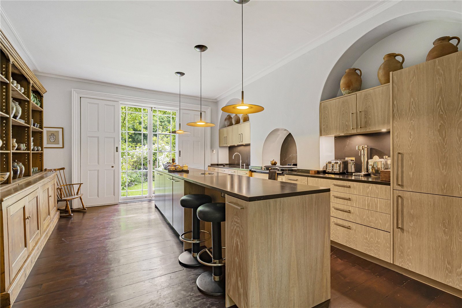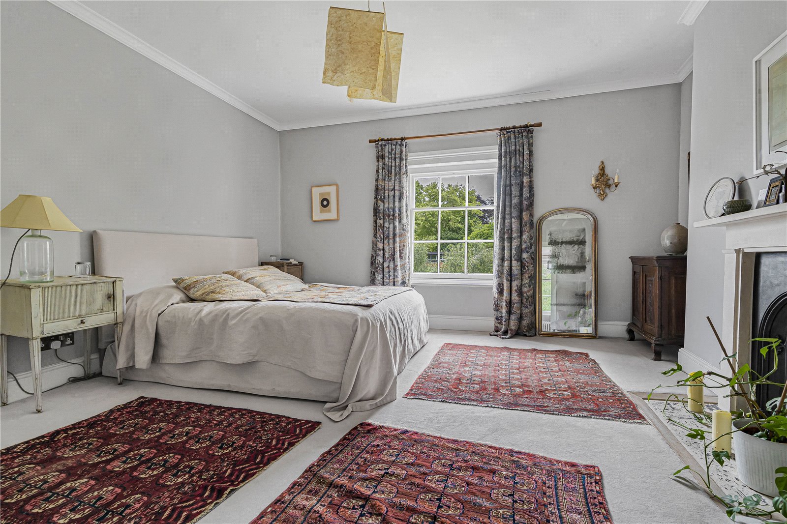 On the ground floor, the welcoming entrance hall leads to a dual aspect sitting room with double doors opening to the impressive kitchen/breakfast room, with AGA, BORA cooktop and Siemens appliances. Both rooms include original features such as large Georgian windows with original sliding shutters and ornate fireplace.