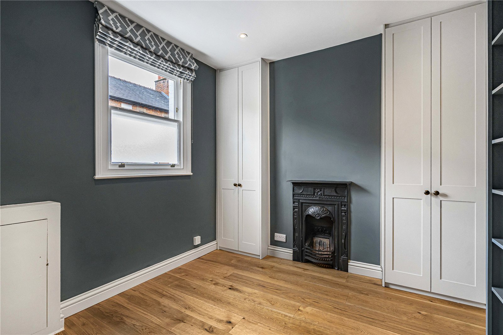 The entrance hall, with bespoke storage, leads to the front reception room, which has a period decorative fireplace and additional built-in storage. This room offers space to be used as a study or third bedroom.